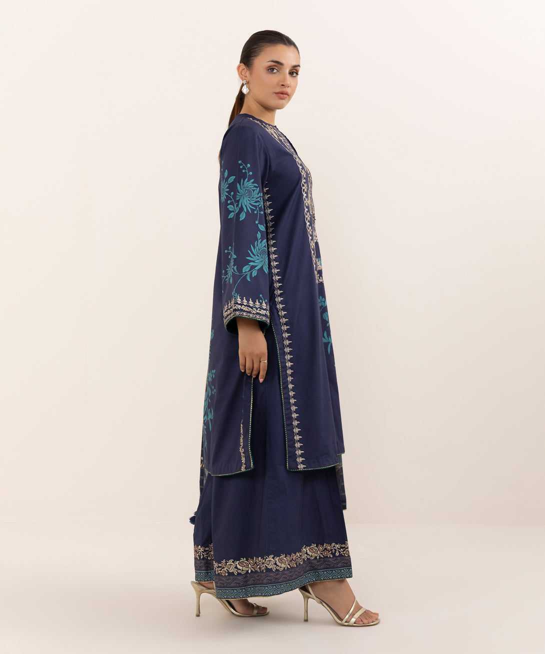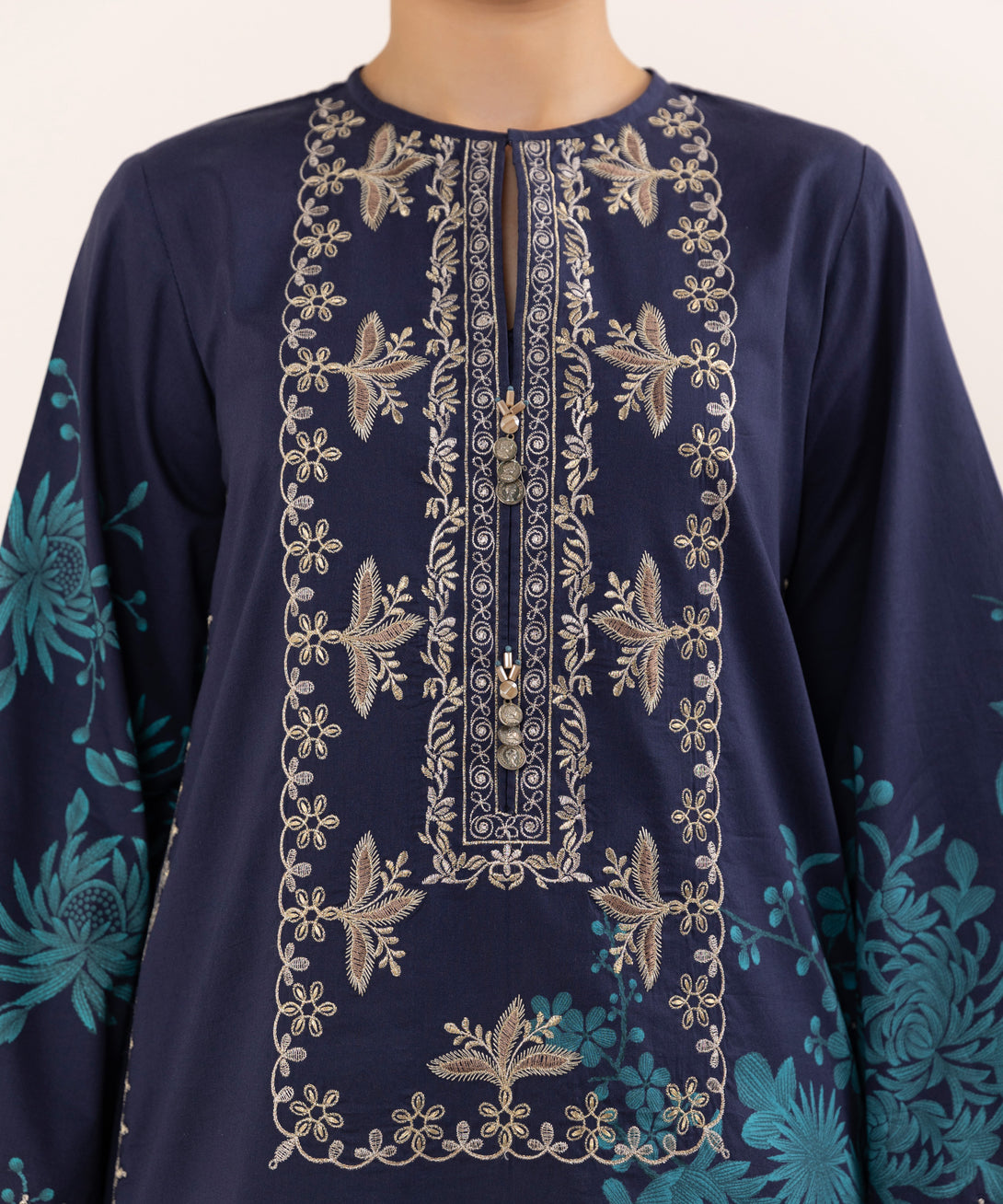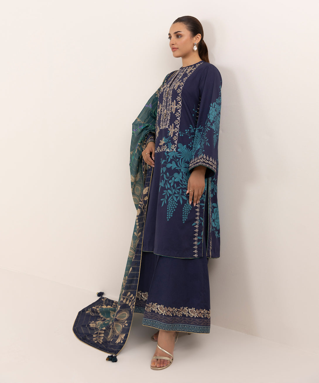Elevate your style with our three-piece embroidered ensemble featuring a lawn shirt paired with a zari voile dupatta and cotton trousers.
