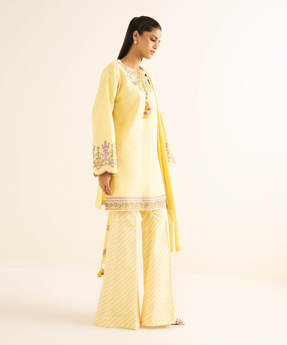 Make a statement with our three-piece embroidered ensemble featuring a khaddar shirt and trousers paired with a blended dupatta.