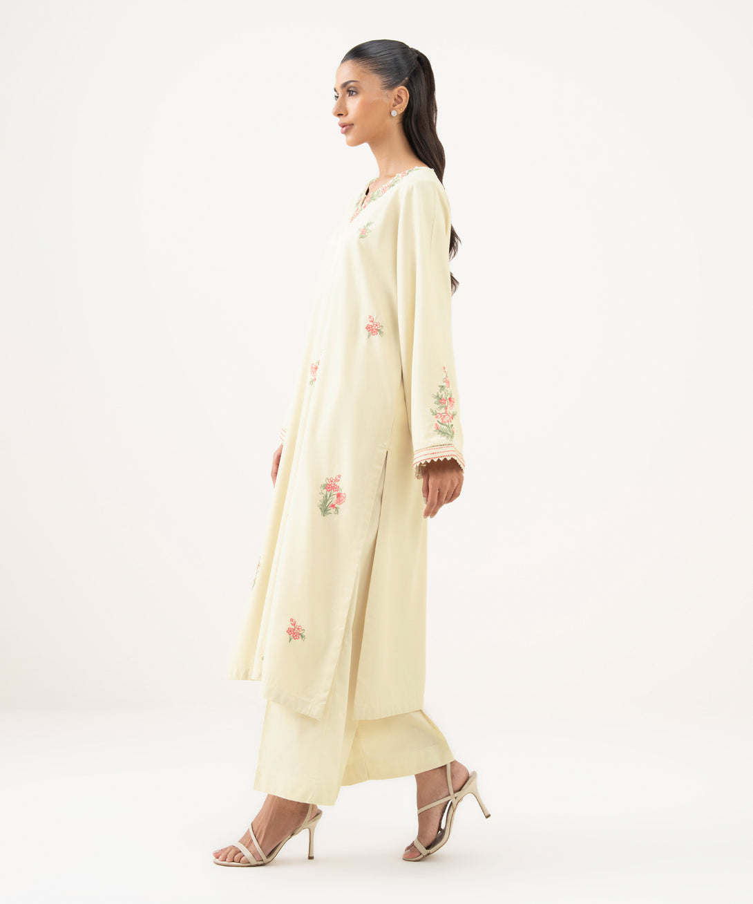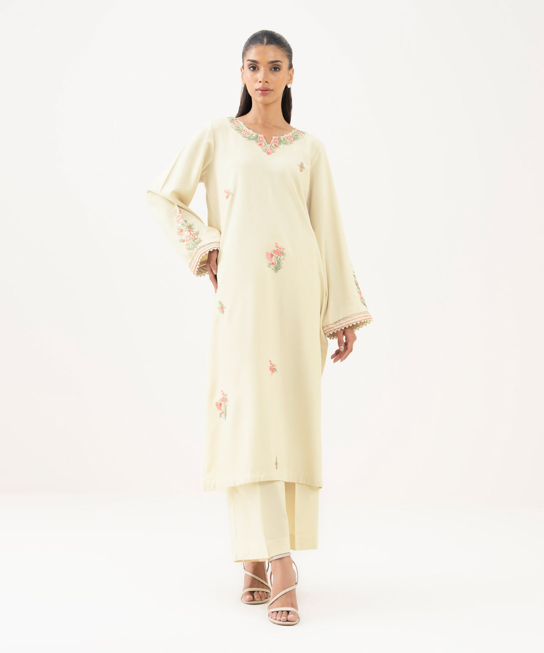 Dyed With Embroidered Front Panel, Dyed Back Panel, Round With Slit Neckline, Full Sleeves, Long Length