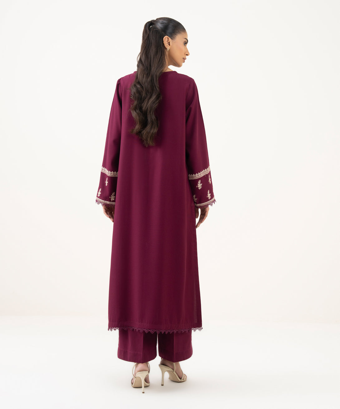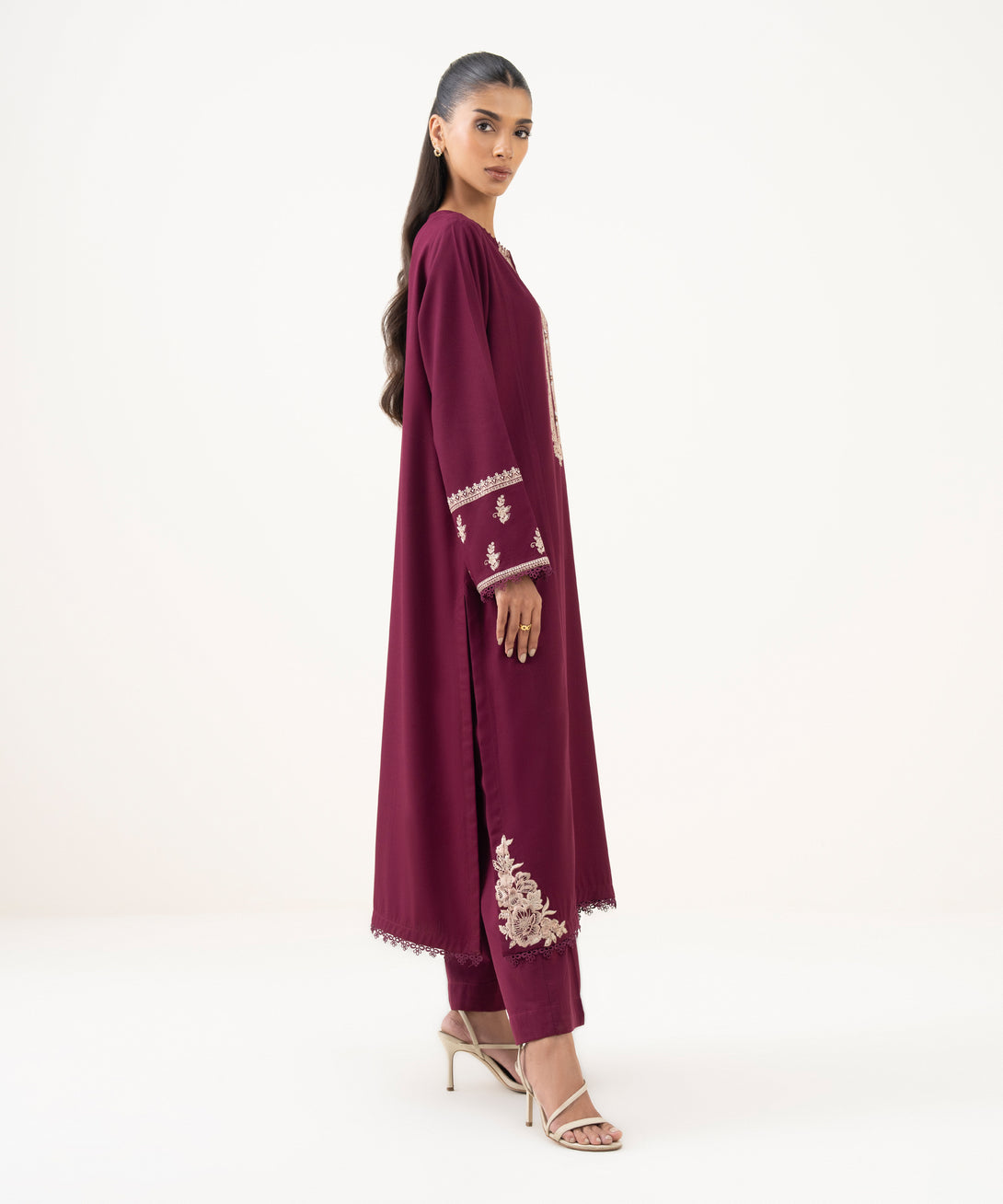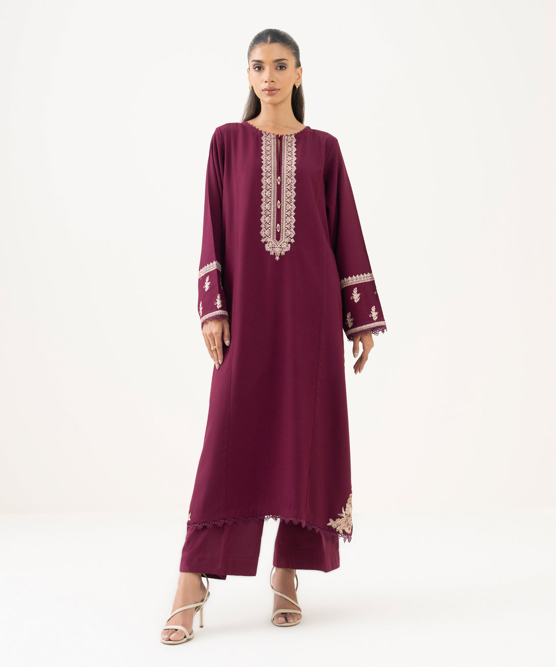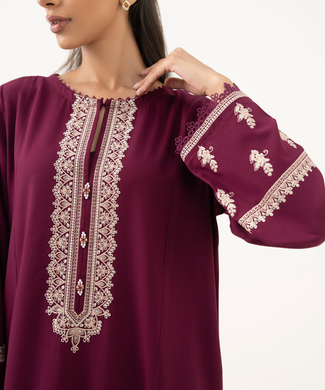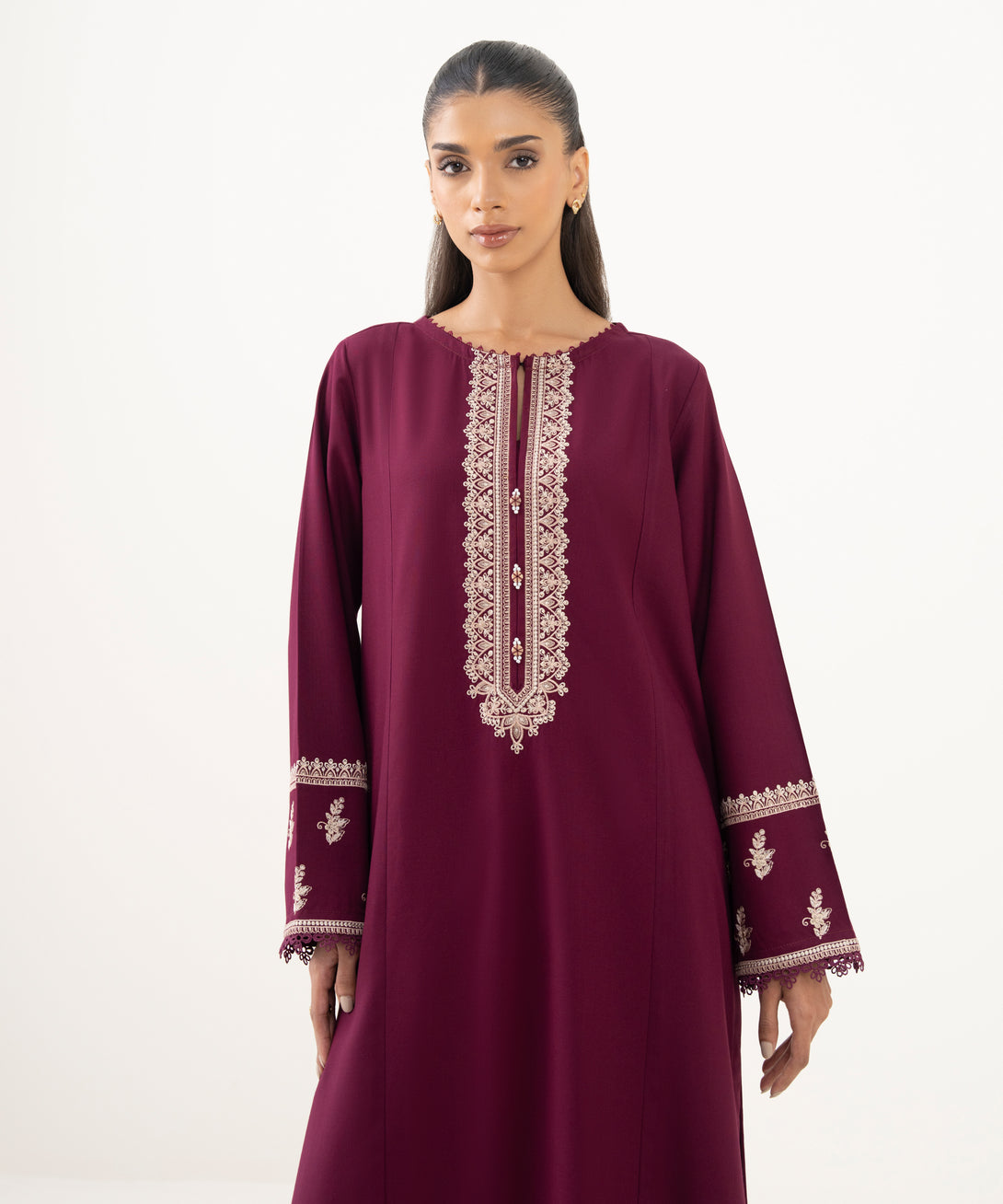 Make a statement in our embroidered maroon cotton viscose A-line shirt featuring a round neckline with slit.