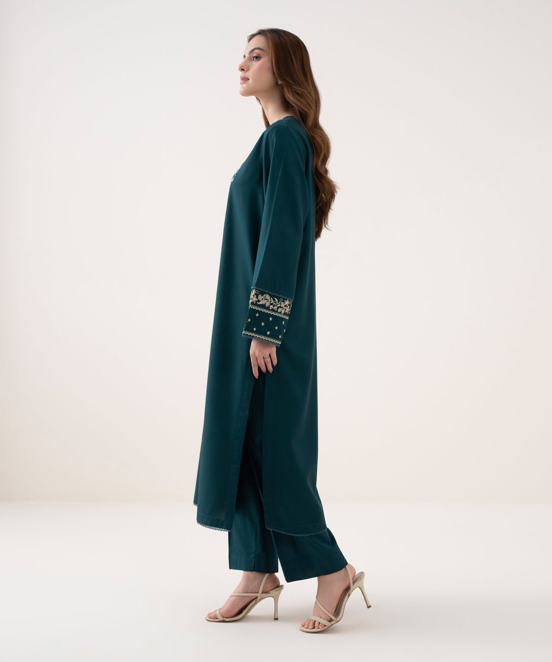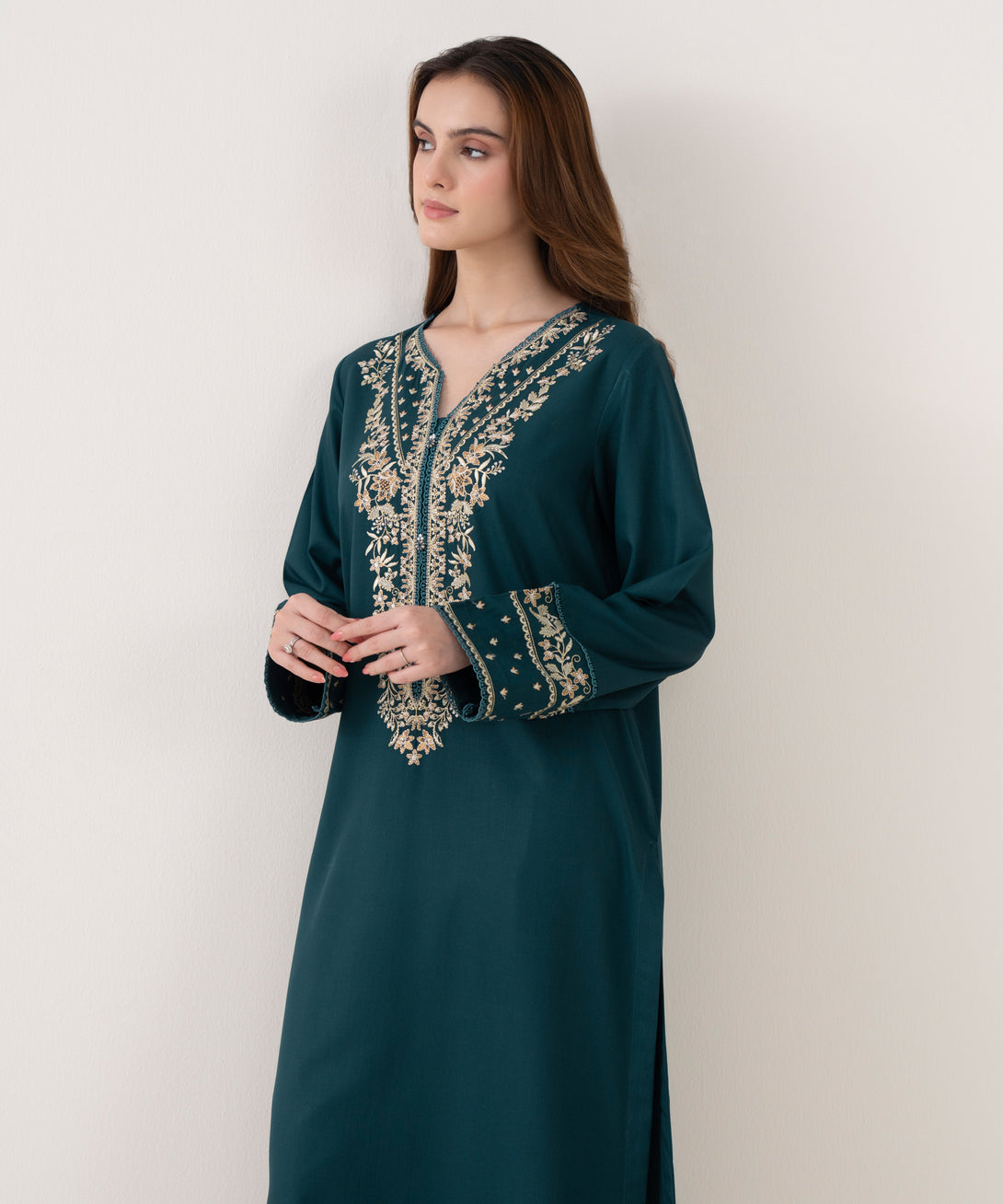 Dyed With Embroidered Front Panel, Dyed Back Panel, Round With Slit Neckline, Full Sleeves, Long Length