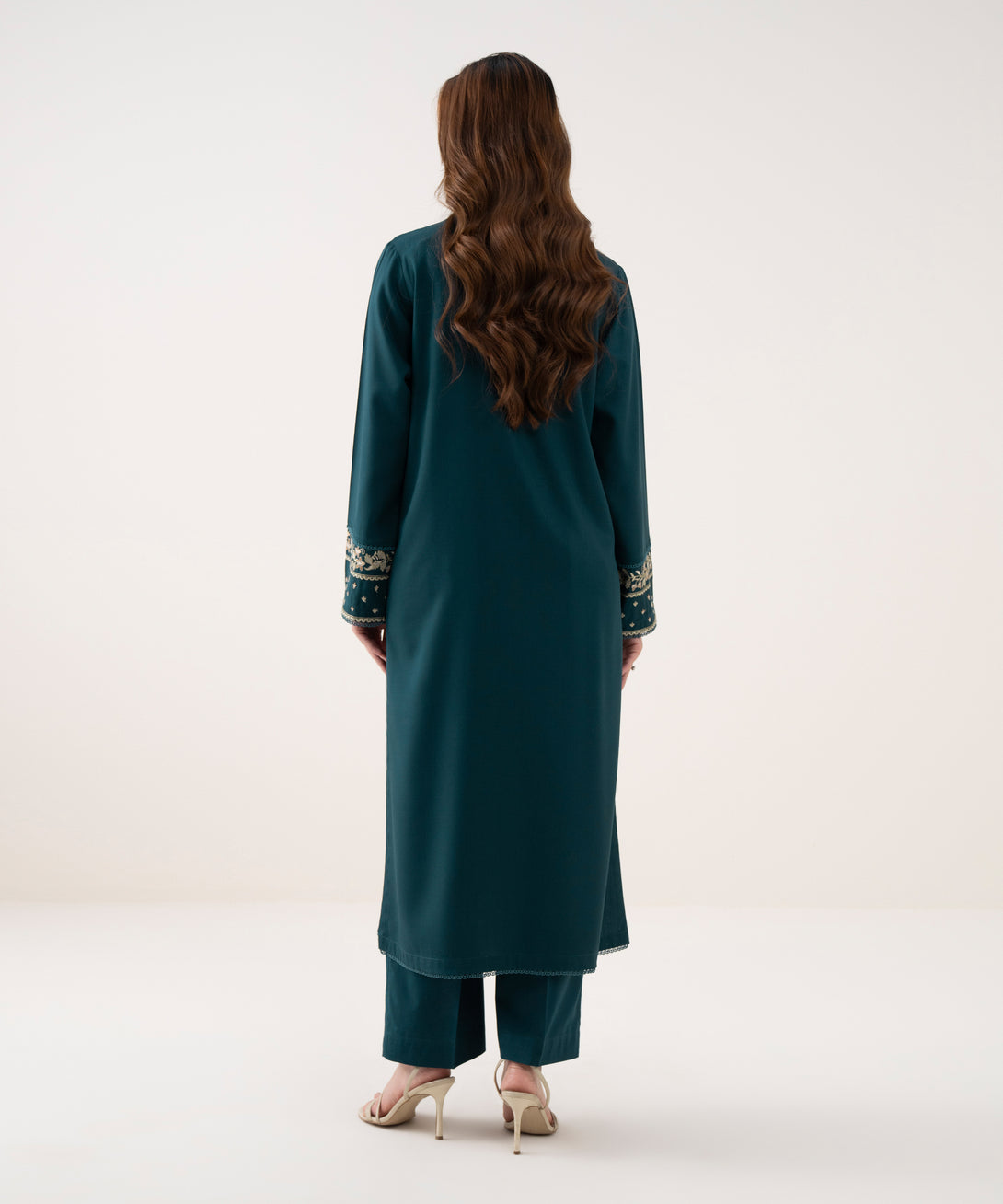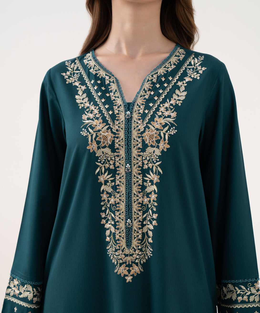 Make a statement in our embroidered teal cotton viscose straight shirt featuring a round neckline with slit.
