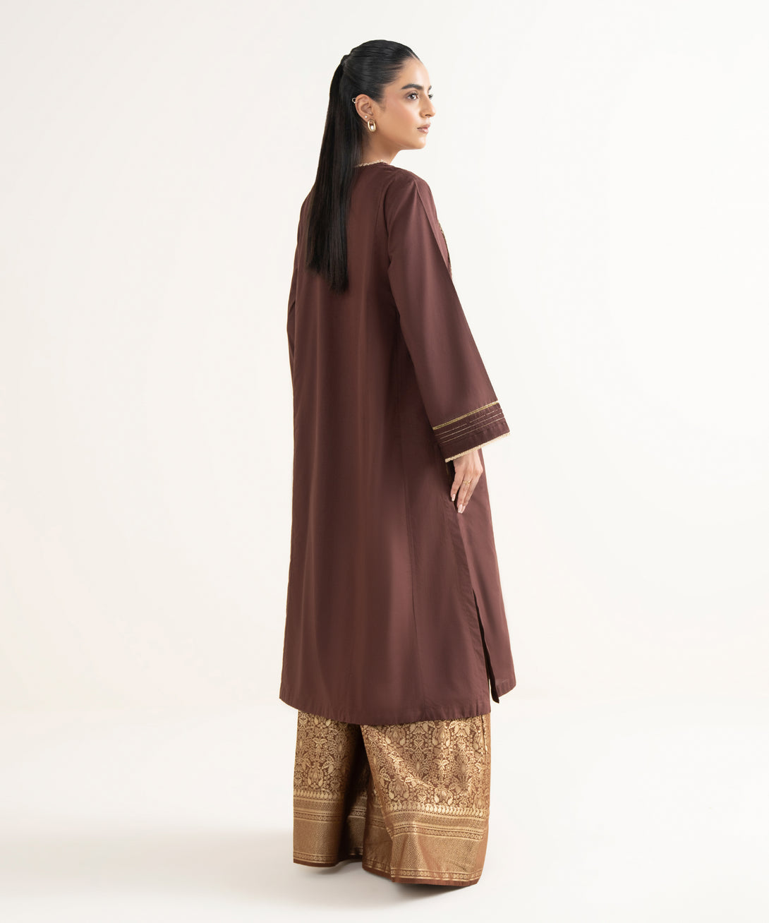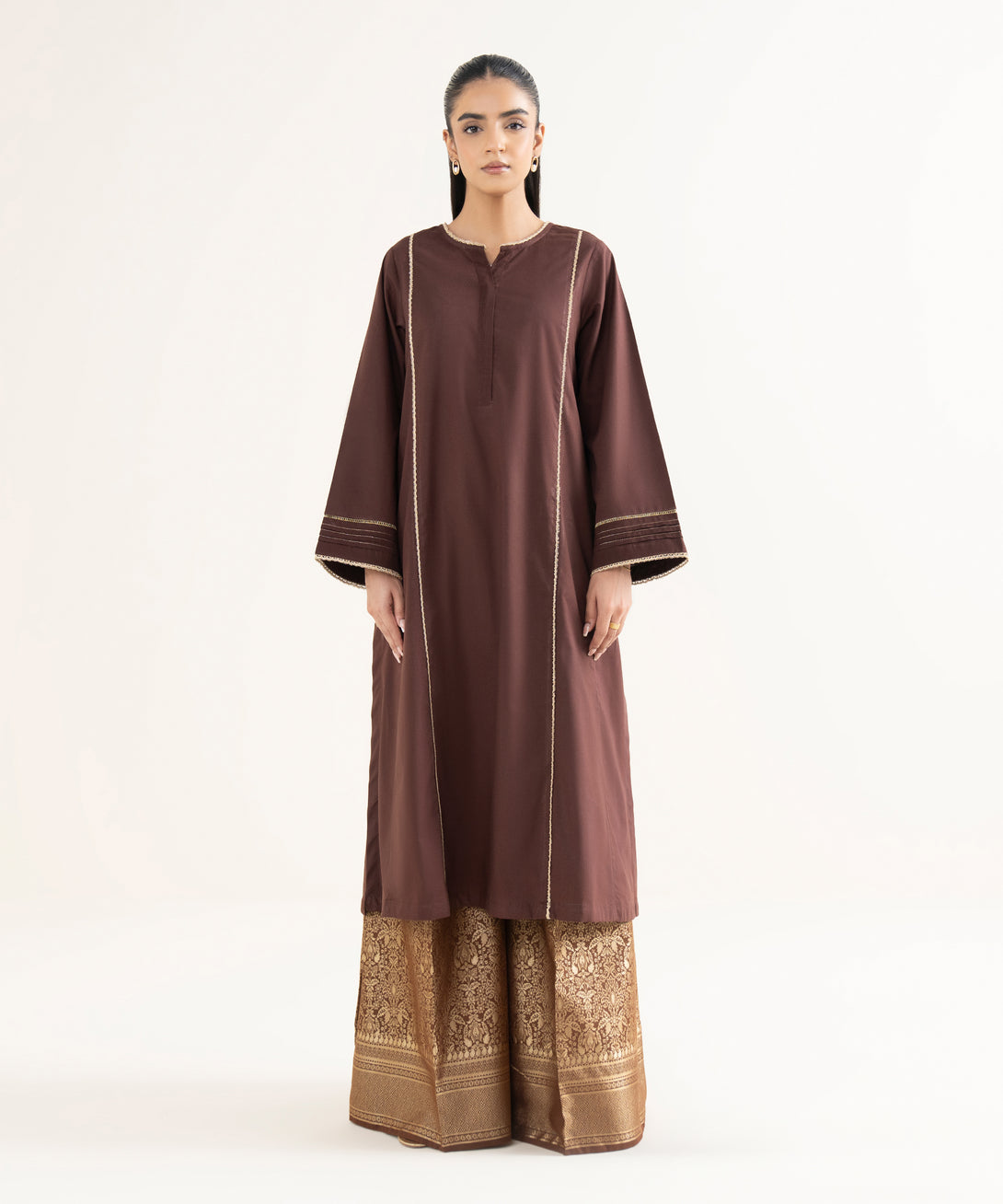 Revamp your closet in our dyed brown cambric flared A-line shirt featuring a round neckline with slit.