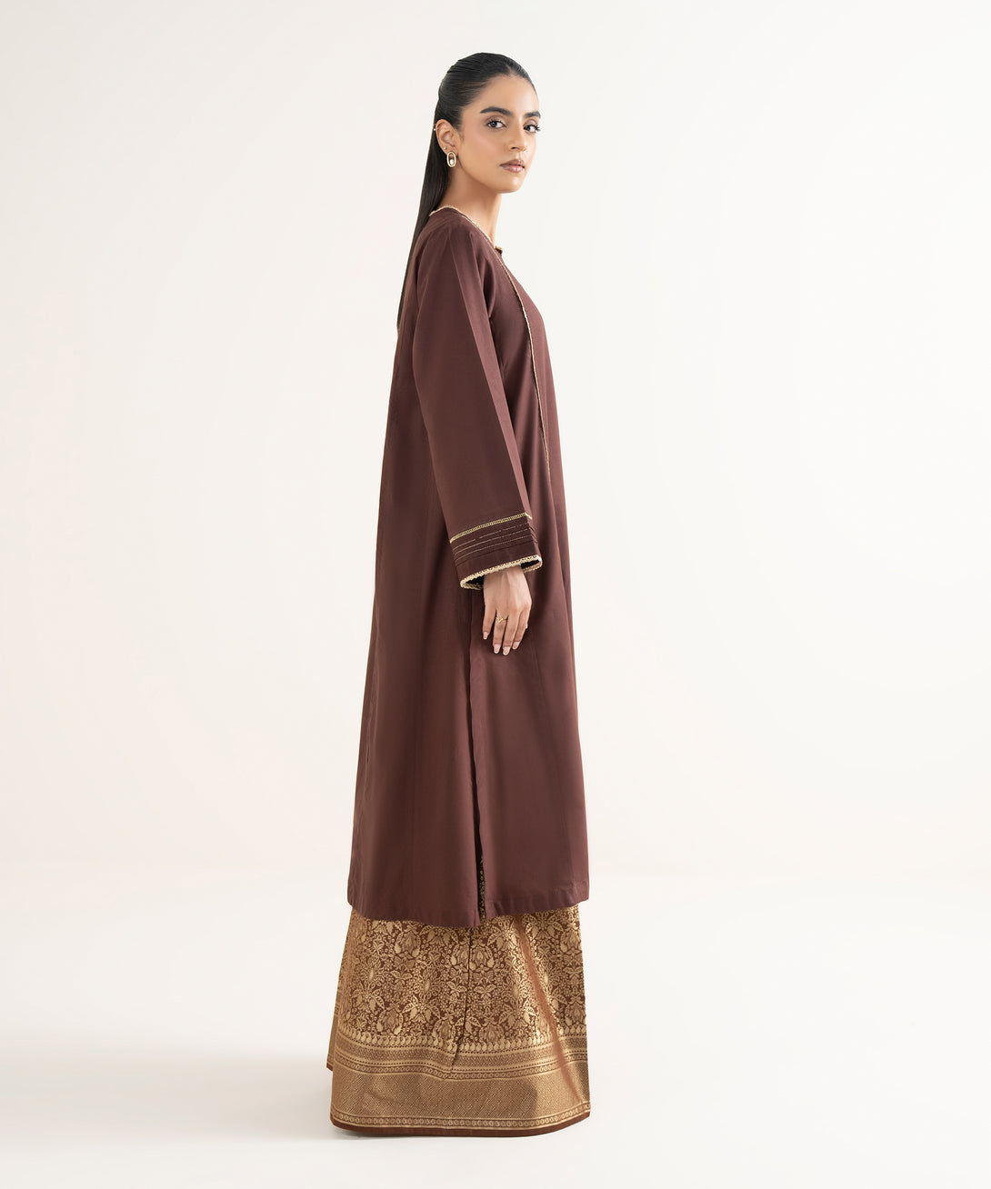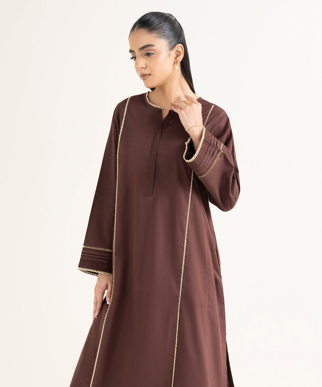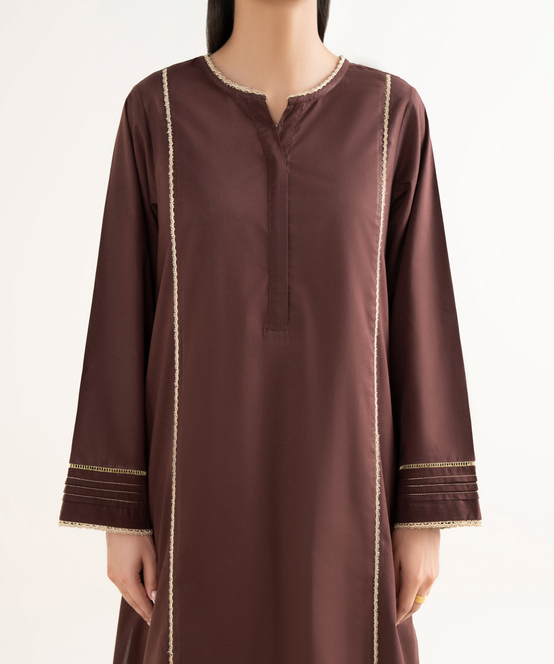 Dyed With Lace Finish Front Panel, Dyed Back Panel, Round With Slit Neckline, Full Sleeves, Long Length