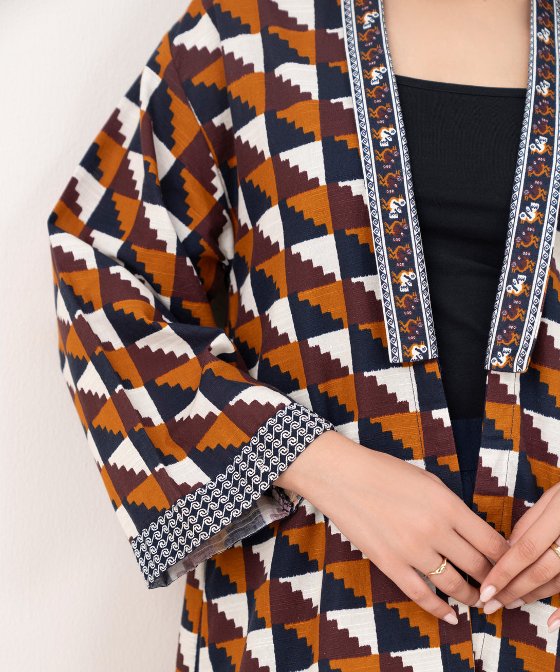 Revamp your wardrobe with our embroidered brown light khaddar front open shirt featuring a y-neckline.