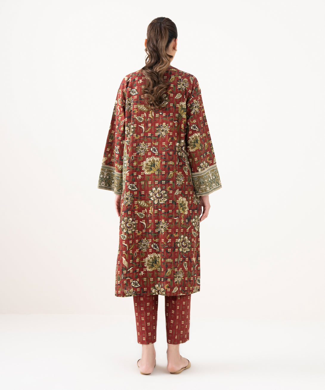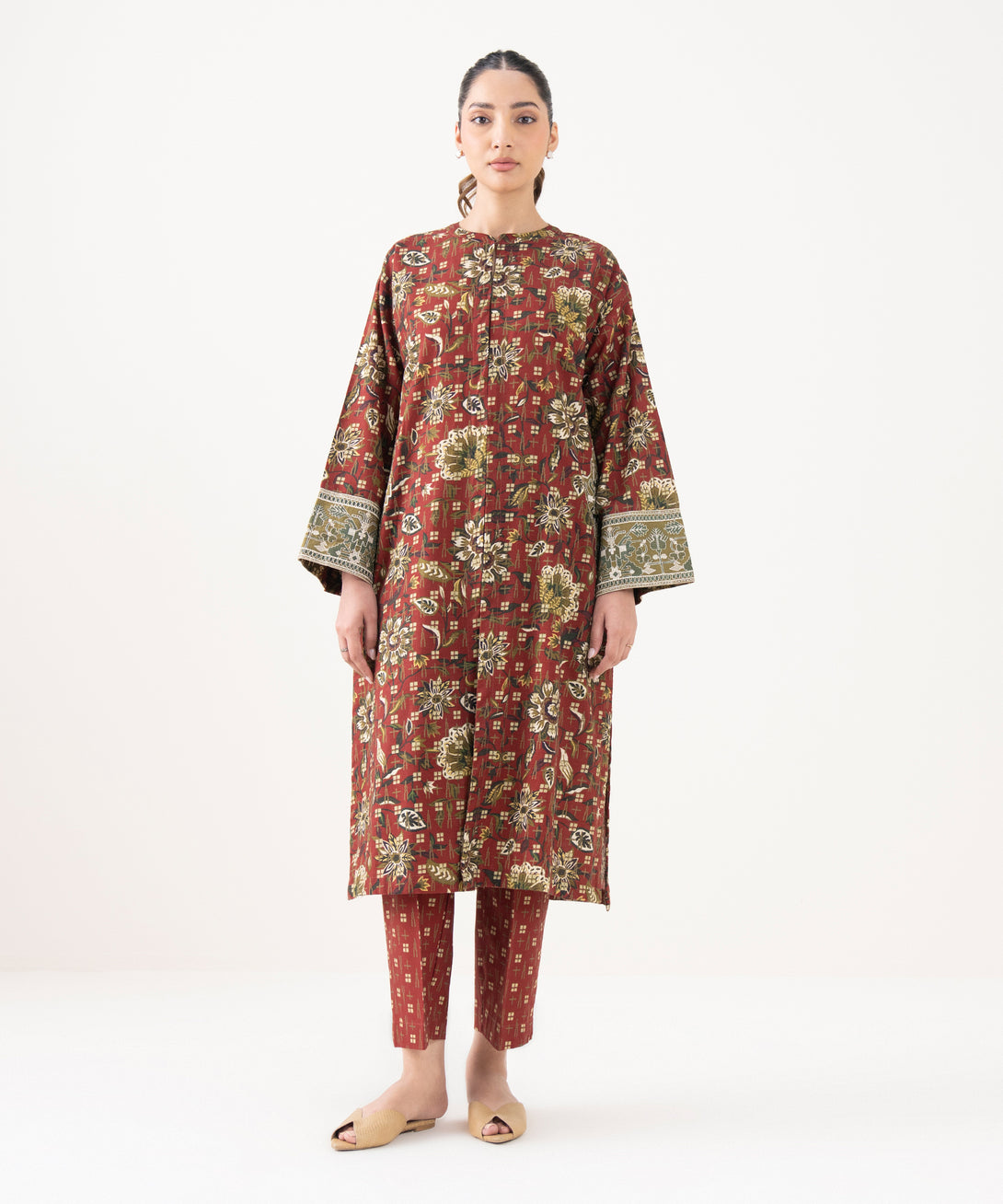 Revamp your wardrobe with our embroidered maroon light khaddar A-line shirt featuring a band front open neckline.