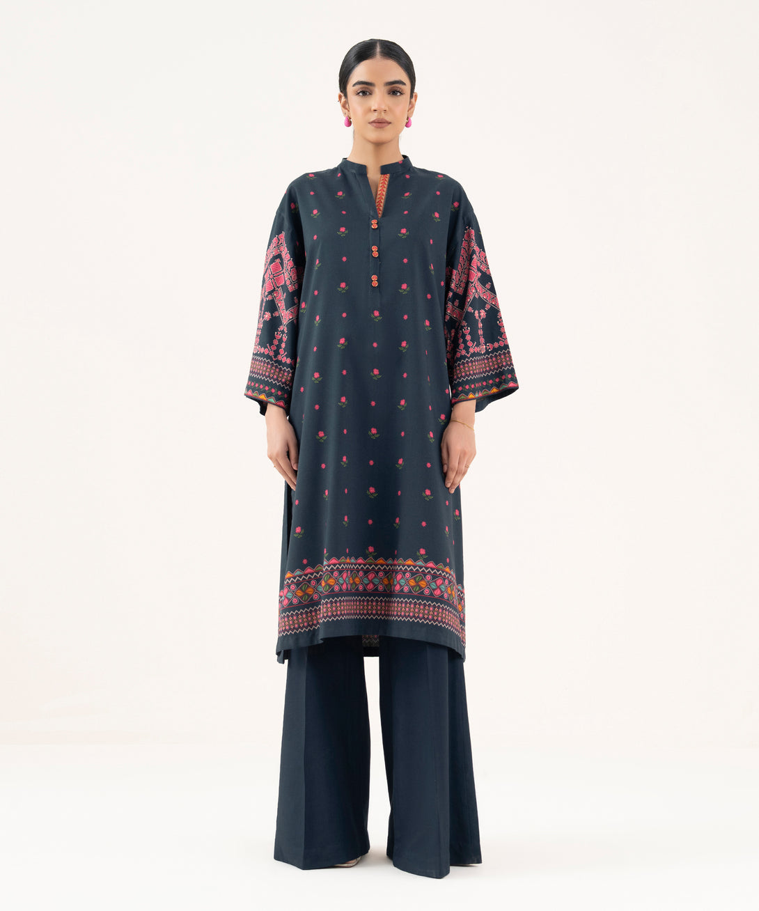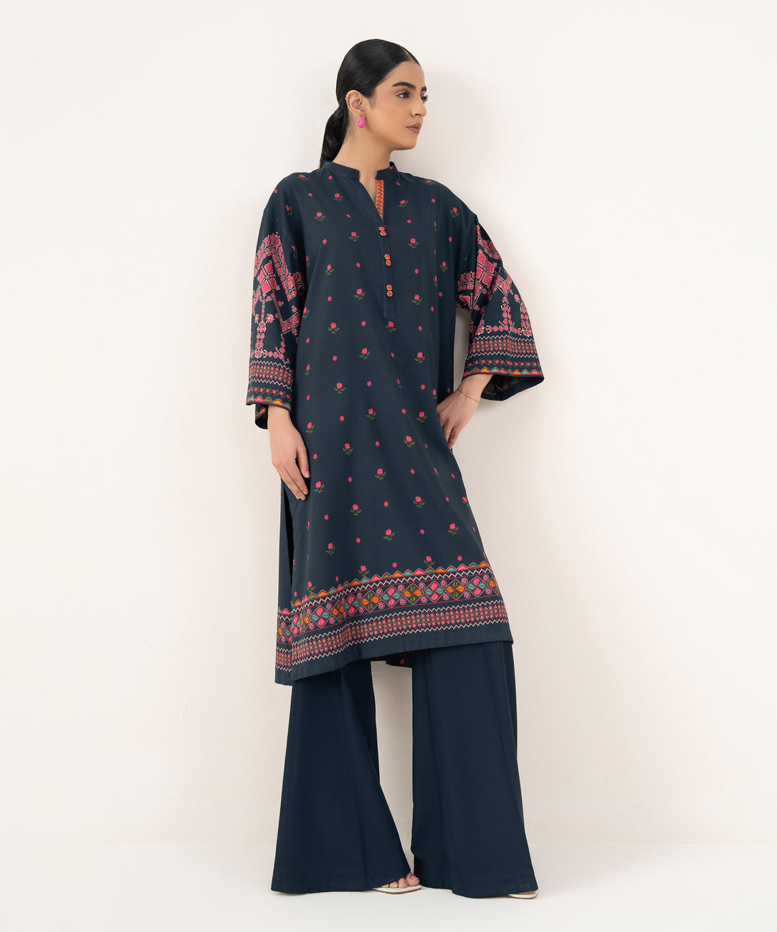 Make a statement with our two-piece printed blue ensemble featuring a cotton shirt and trousers.