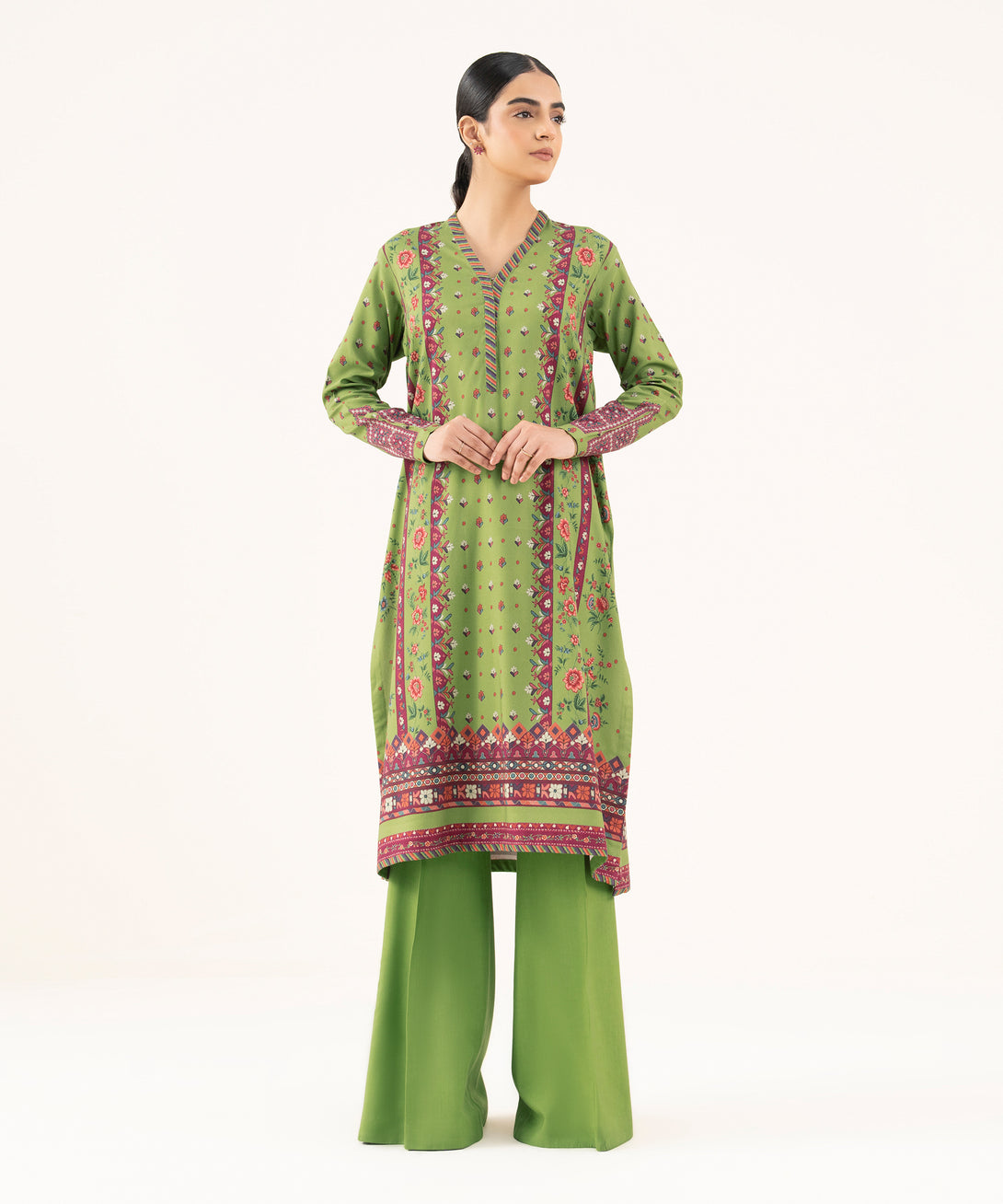 Make a statement with our two-piece printed parrot green ensemble featuring a cotton shirt and trousers.