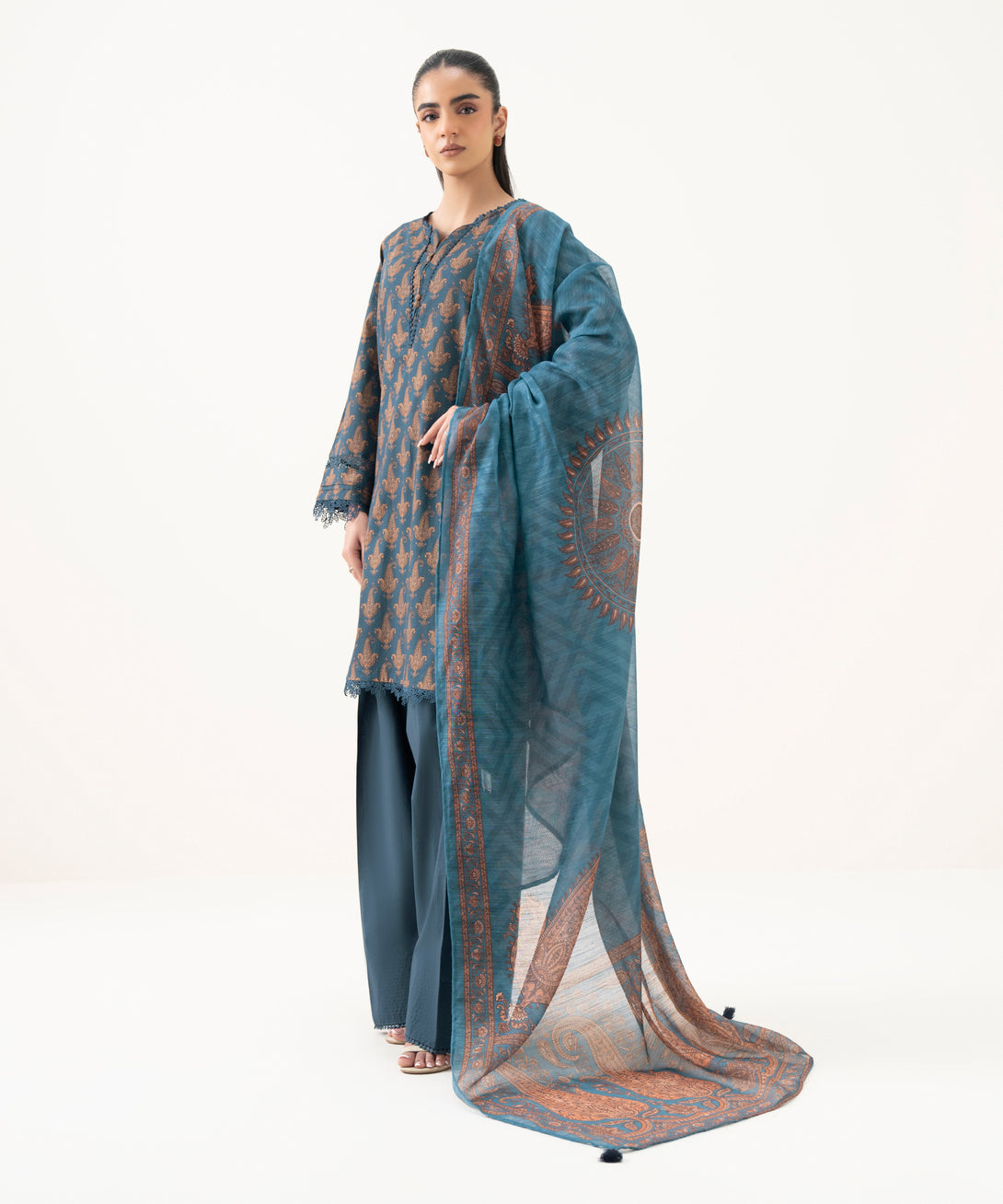 Printed With Lace Finish Front Panel, Printed Back Panel, Round With Slit Neckline, Full Sleeves, Long Length