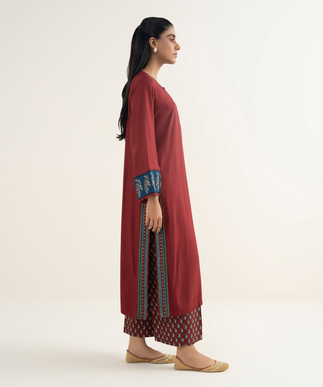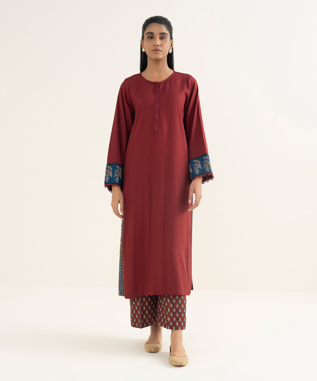 Upgrade your style in our dyed maroon textured viscose straight shirt featuring a round neckline with placket.