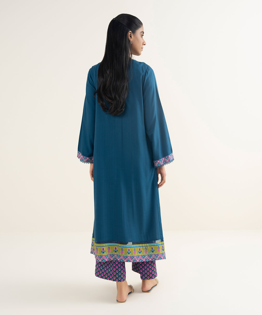 Dyed With Printed Accent And Lace Finish Front Panel, Dyed Back Panel, Round With Placket Neckline, Full Sleeves, Long Length