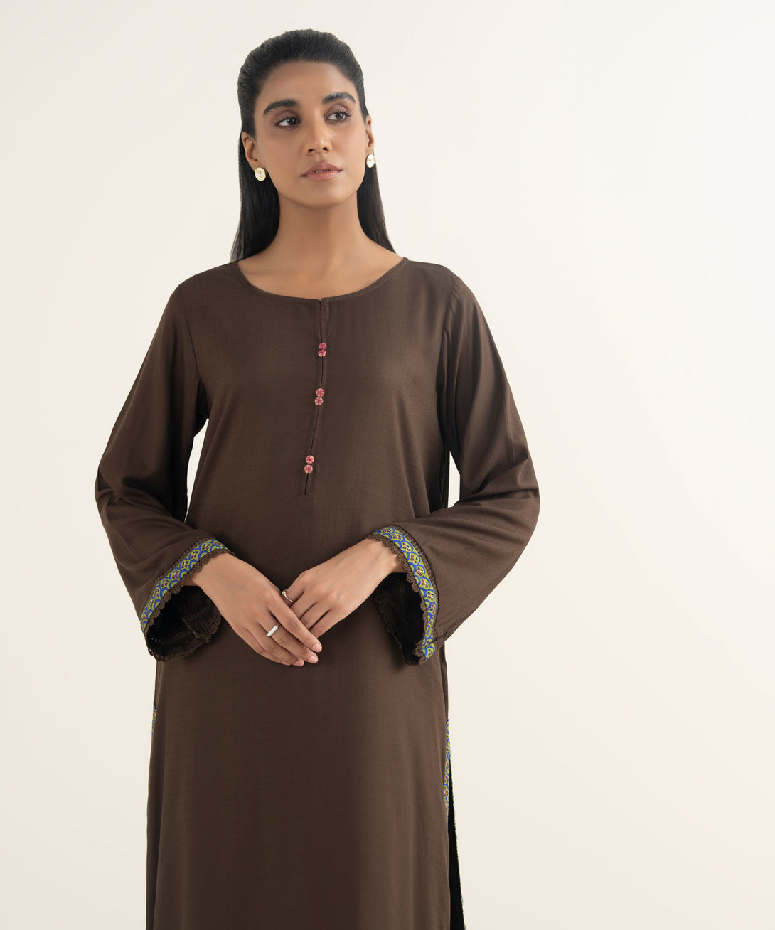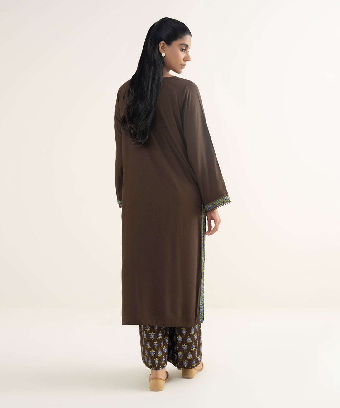 Upgrade your style in our dyed brown textured viscose straight shirt featuring a round neckline with slit.