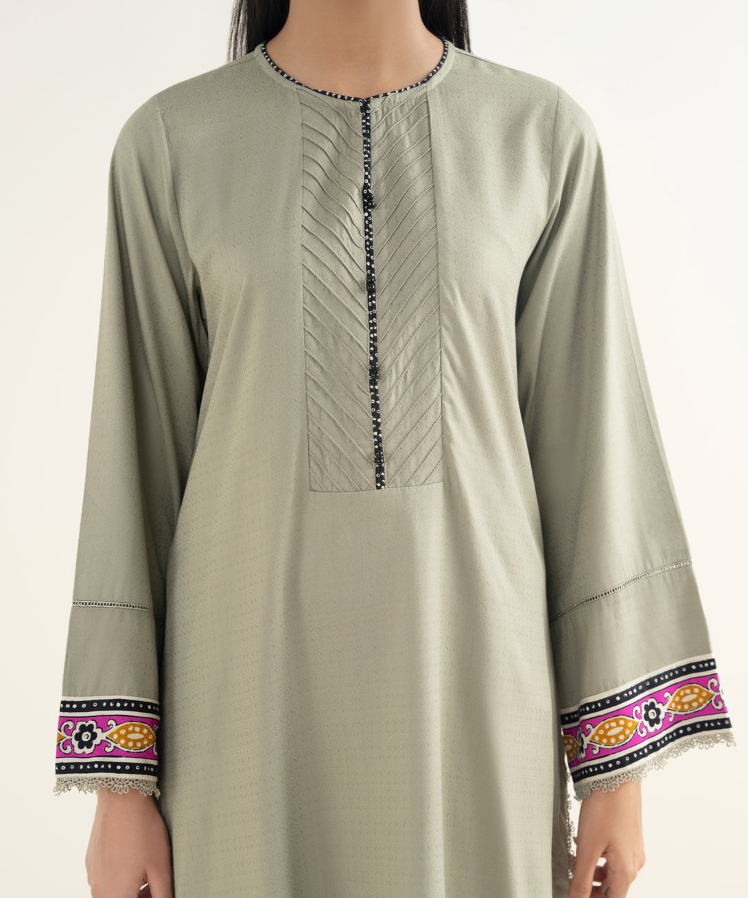 Dyed With Printed Accent And Lace Finish Front Panel, Dyed Back Panel, Round With Slit Neckline, Full Sleeves, Long Length