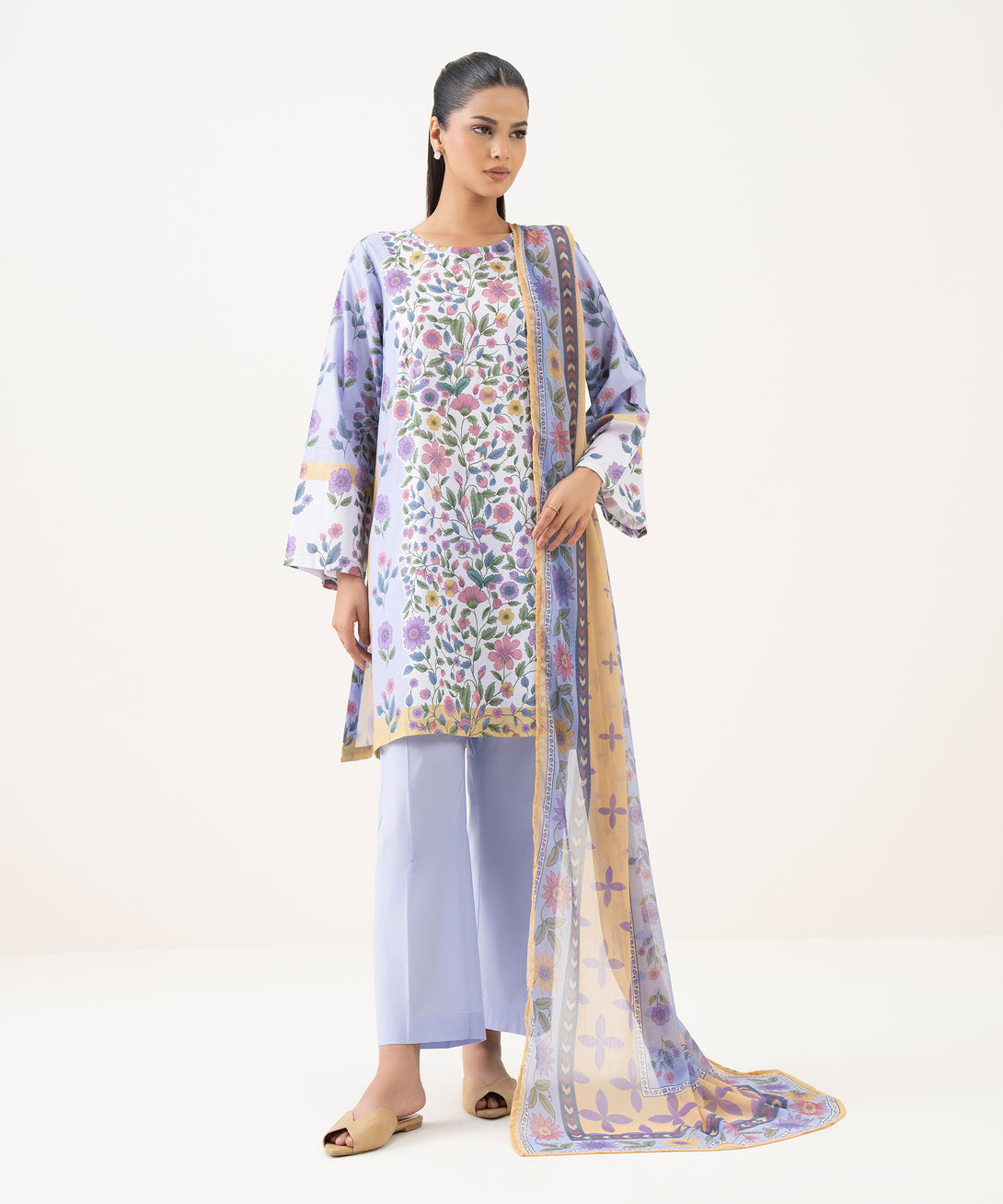Refresh your wardrobe with our printed lilac lawn straight shirt featuring a round neckline.