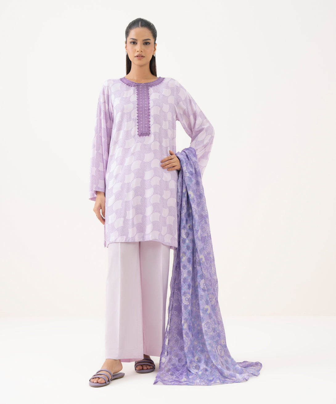 Upgrade your wardrobe with our embroidered lilac arabic lawn straight shirt featuring a round neckline.