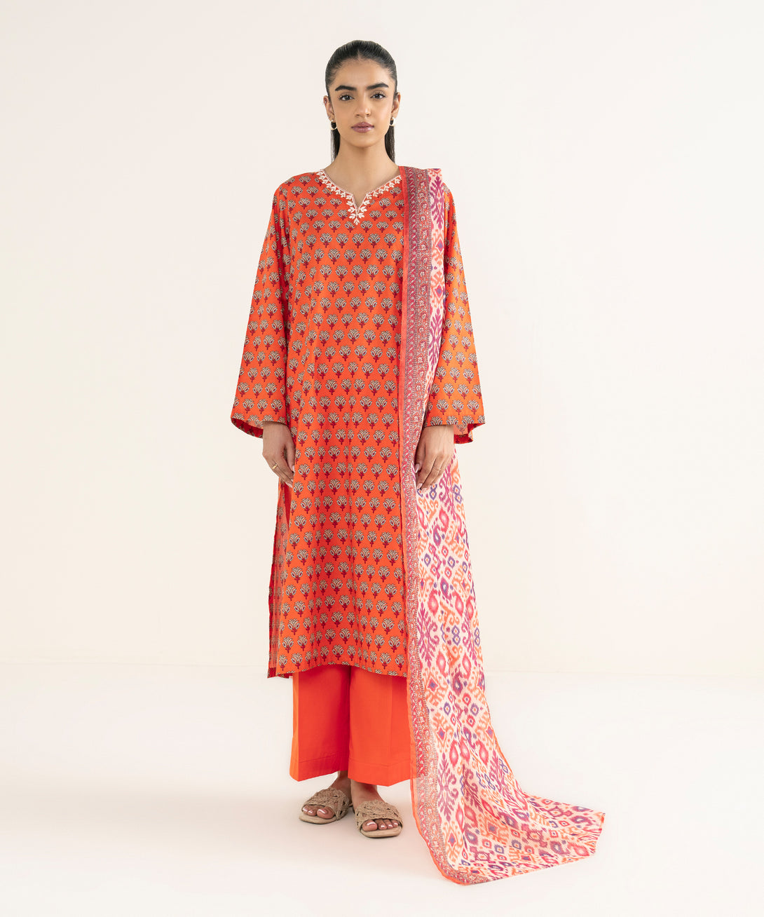 Upgrade your wardrobe with our embroidered orange lawn straight shirt featuring a round neckline and slit.
