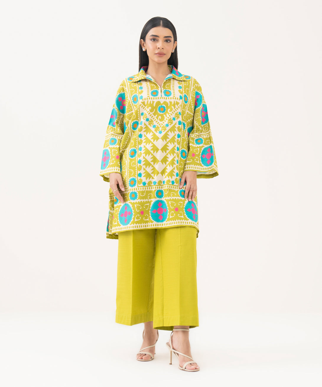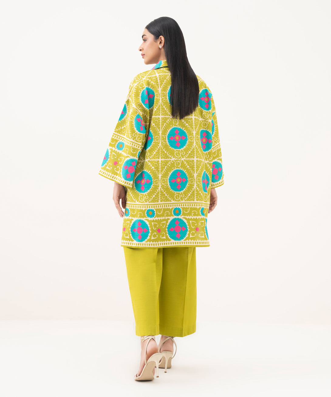 Upgrade your style in our printed green light khaddar drop shoulder shirt featuring a collared neckline with slit.