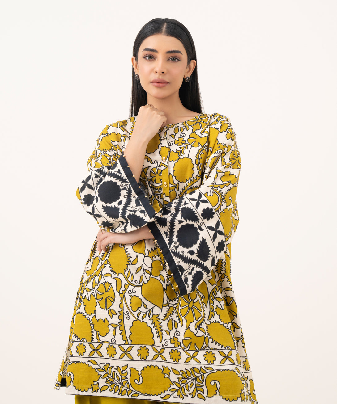 Upgrade your style in our printed green light khaddar drop shoulder shirt featuring a round neckline with placket.