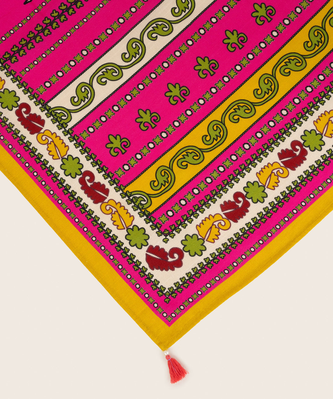 Drape yourself in our printed pink light khaddar dupatta featuring tassels.