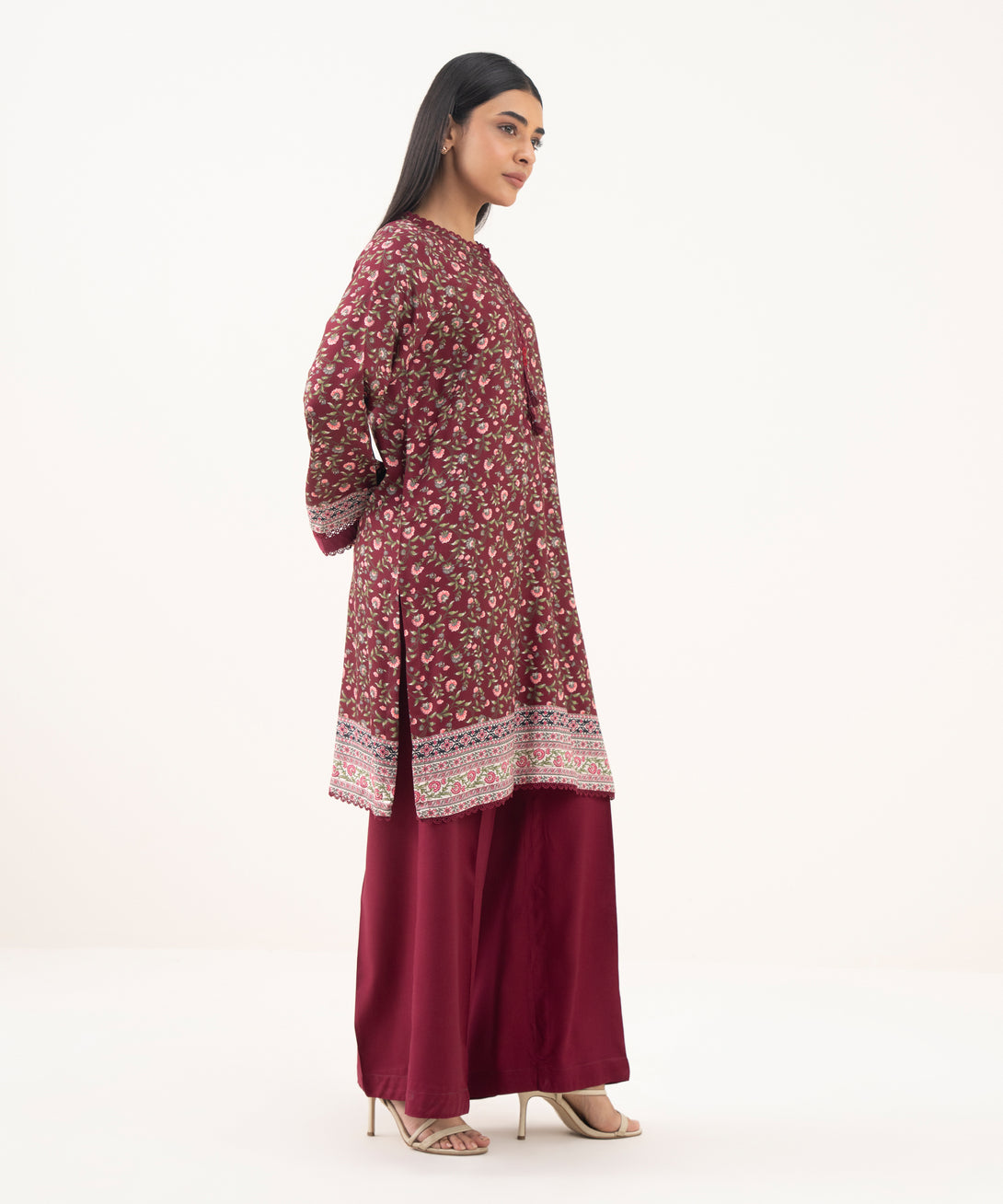 Printed With Lace Finish Front Panel, Printed Back Panel, Round With Slit Neckline, Full Sleeves, Short Length