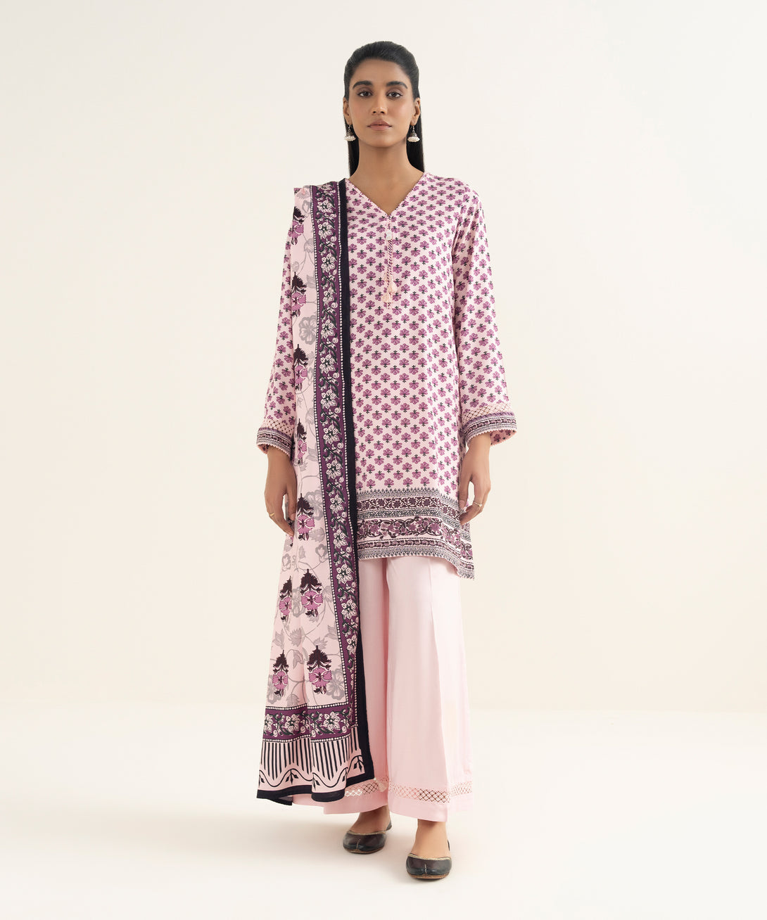 Drape yourself in our printed pink linen viscose dupatta featuring tassels.