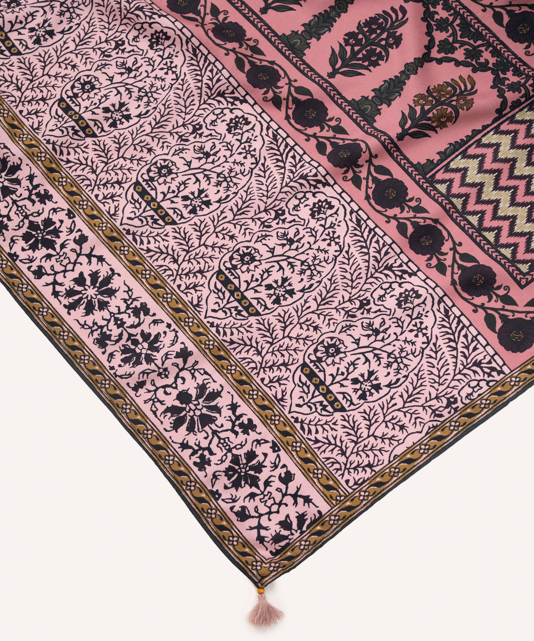 Drape yourself in our printed pink linen viscose dupatta featuring tassels.