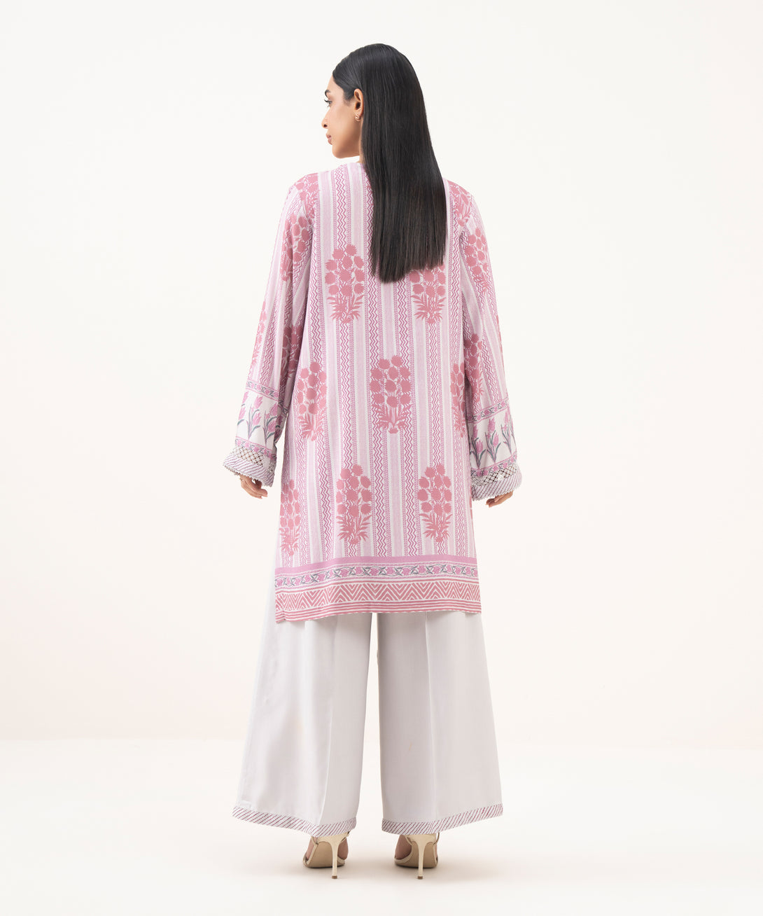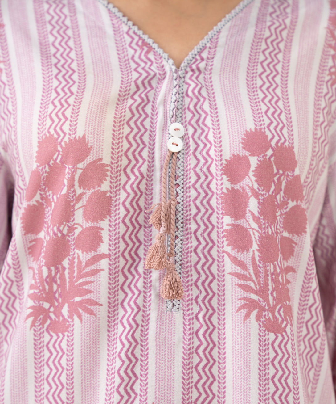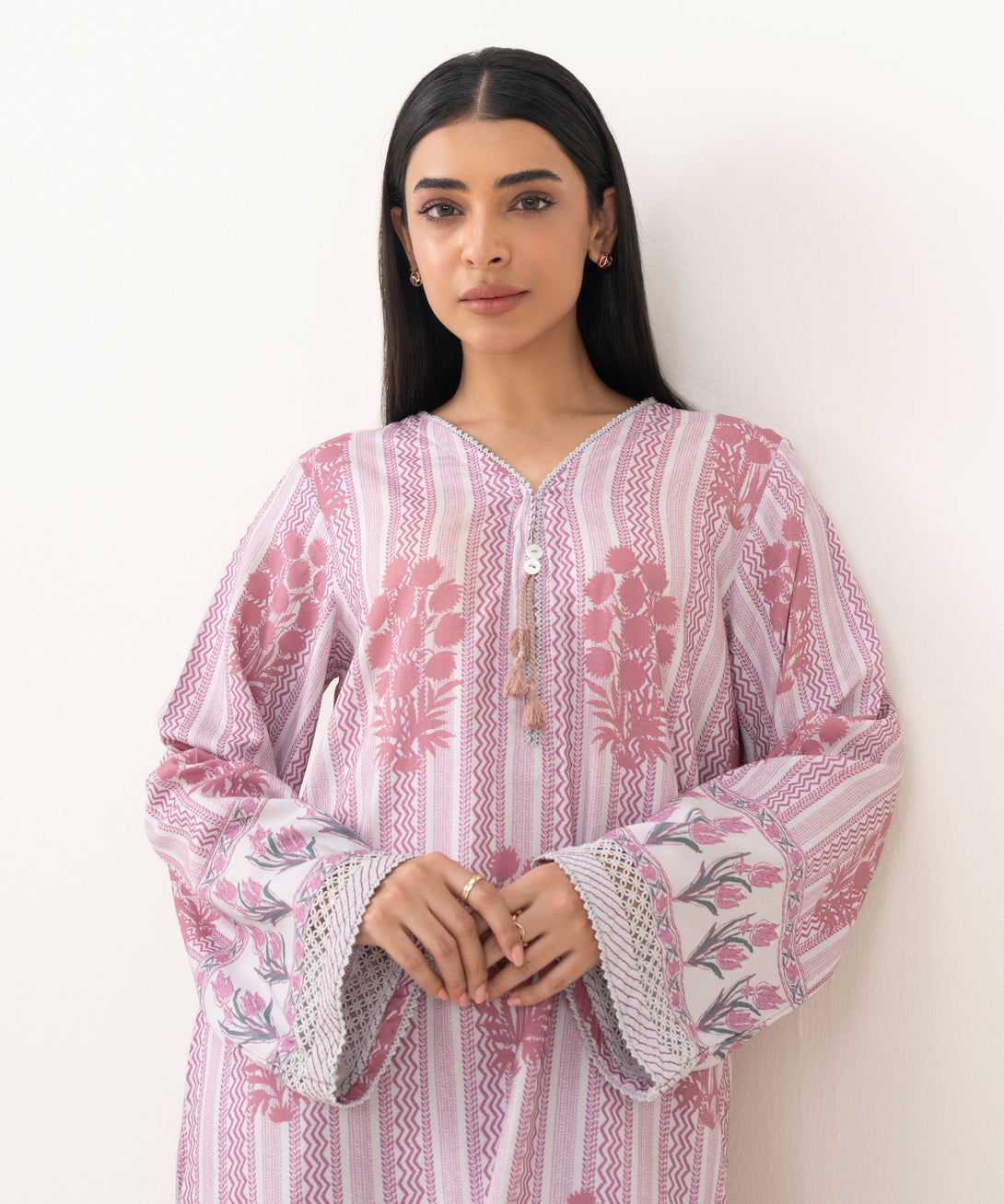 Printed With Lace Finish And Top Stitch Front Panel, Printed Back Panel, V Neckline, Full Sleeves, Mid Length