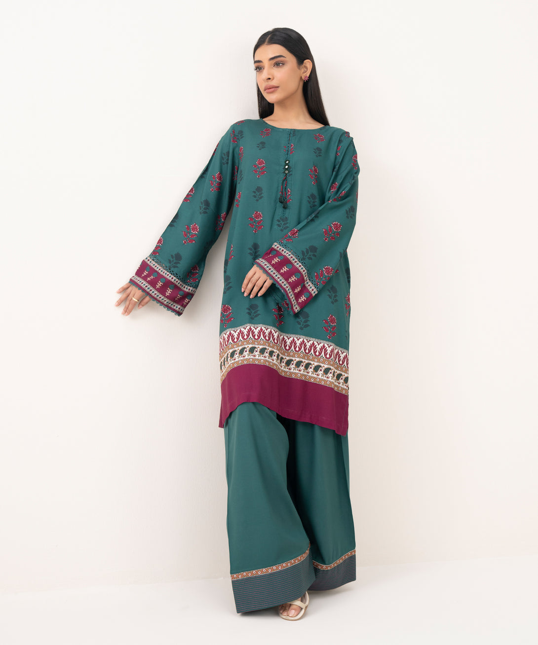 Upgrade your style in our printed green linen viscose straight shirt featuring a round neckline with slit.