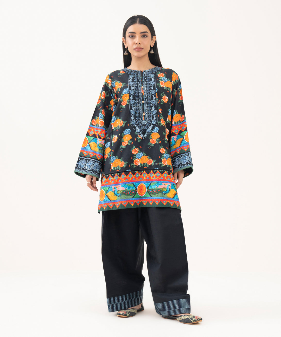 Printed With Embroidered Front Panel, Printed Back Panel, Round With Slit Neckline, Full Sleeves, Short Length