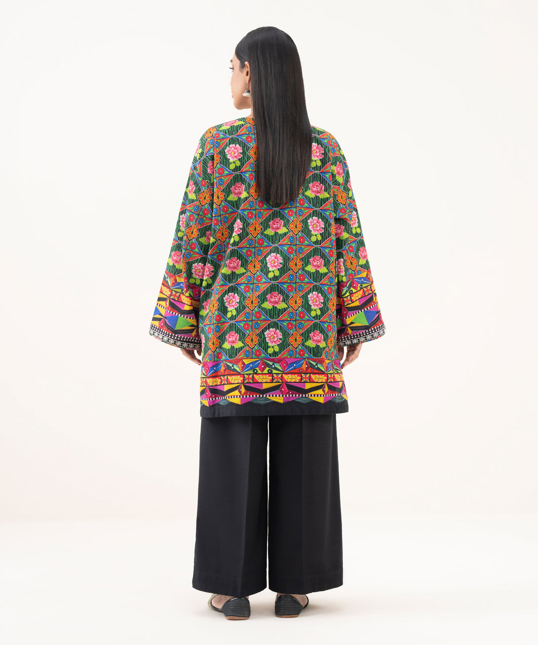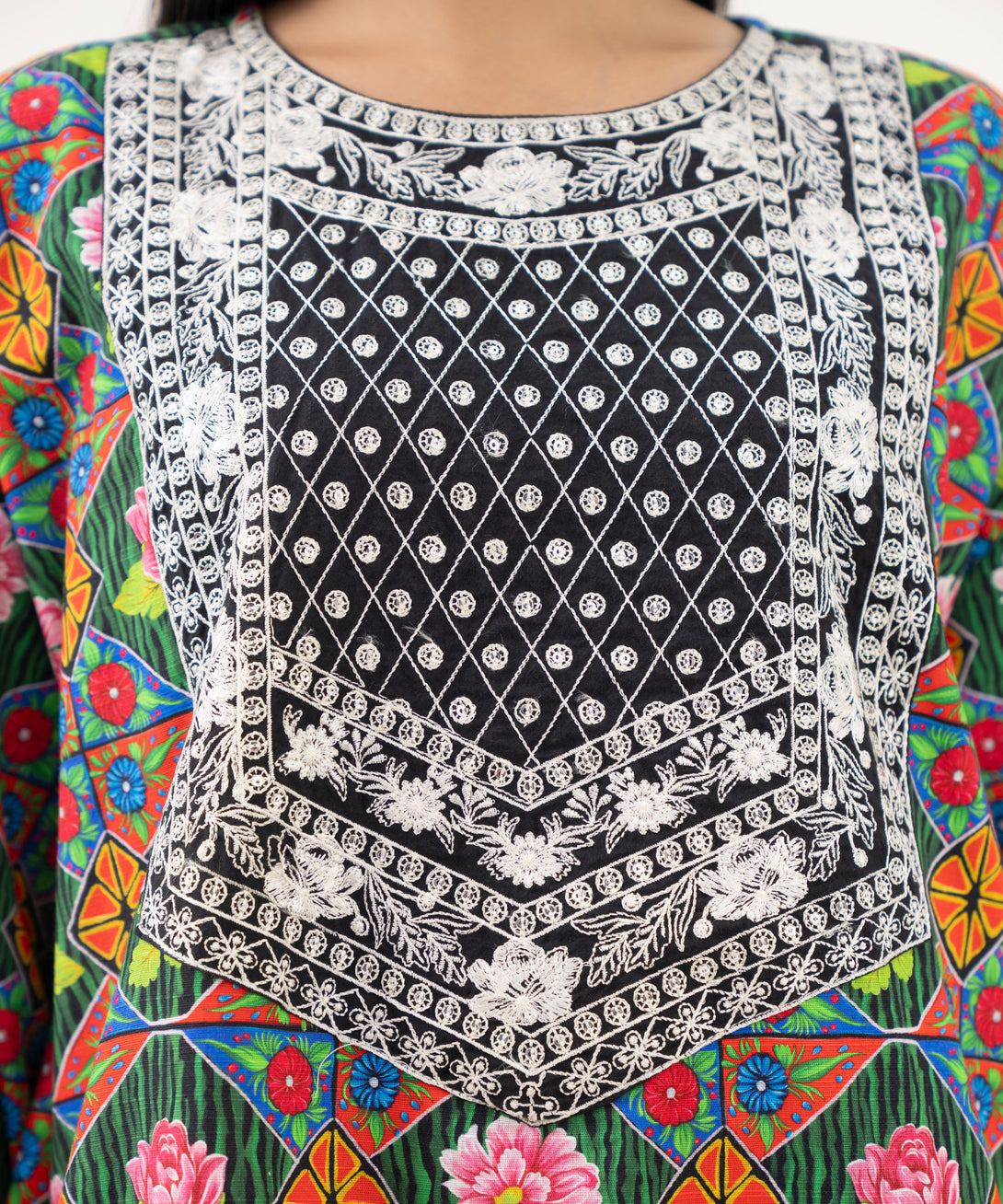 Printed With Embroidered Front Panel, Printed Back Panel, Round Neckline, Full Sleeves, Short Length