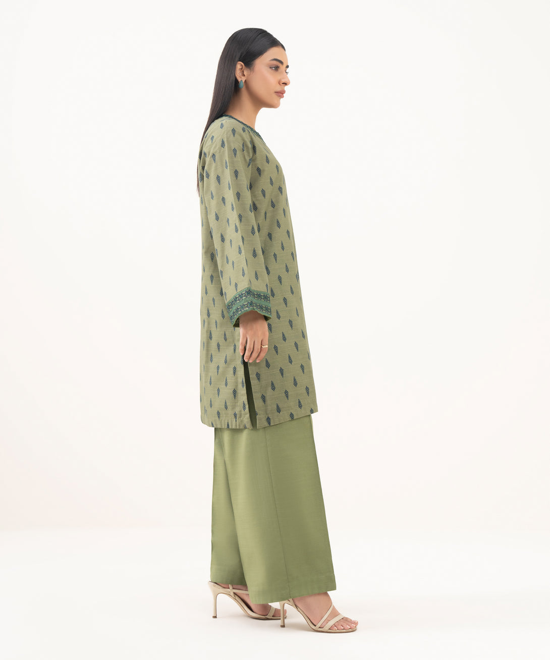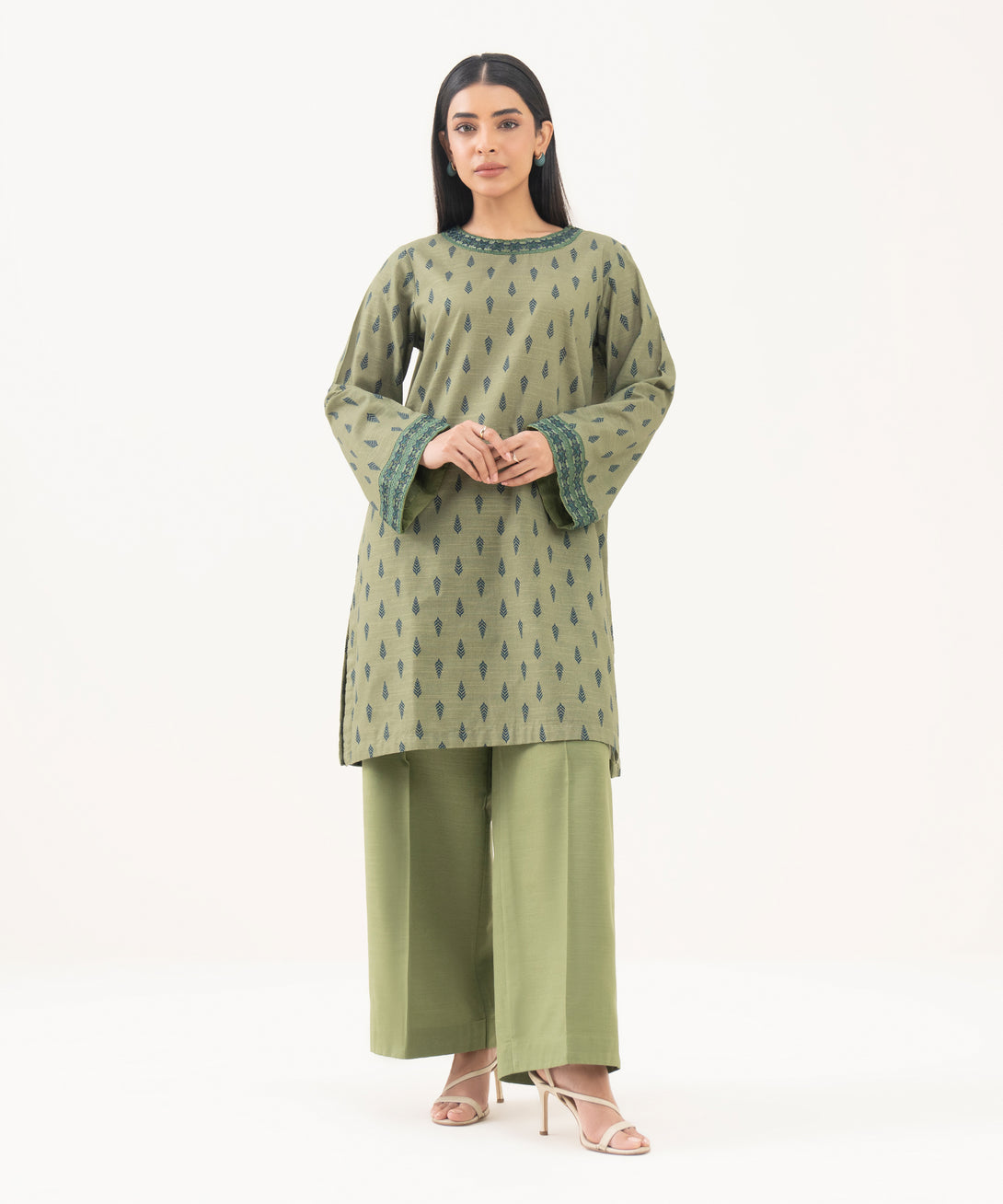 Revamp your wardrobe with our embroidered green light khaddar straight shirt featuring a round neckline.