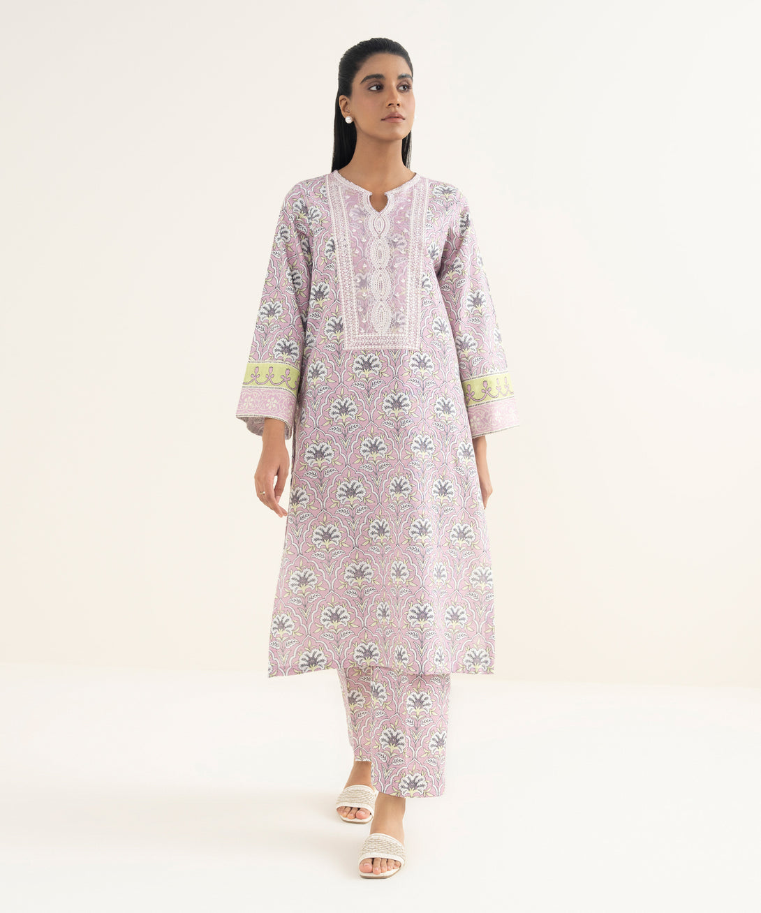 Revamp your wardrobe with our embroidered light khaddar straight shirt featuring a round neckline with keyhole detail.