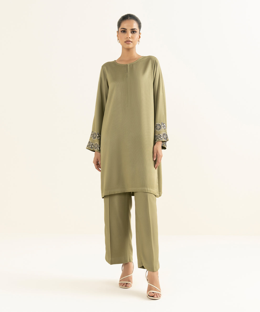 Revamp your wardrobe with our embroidered olive green bedford straight shirt featuring a round neckline with slit.