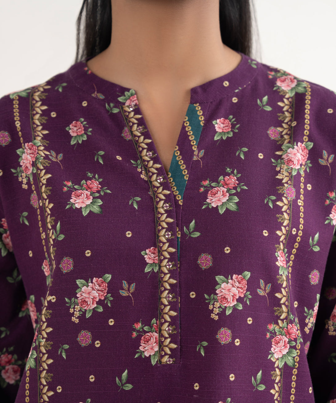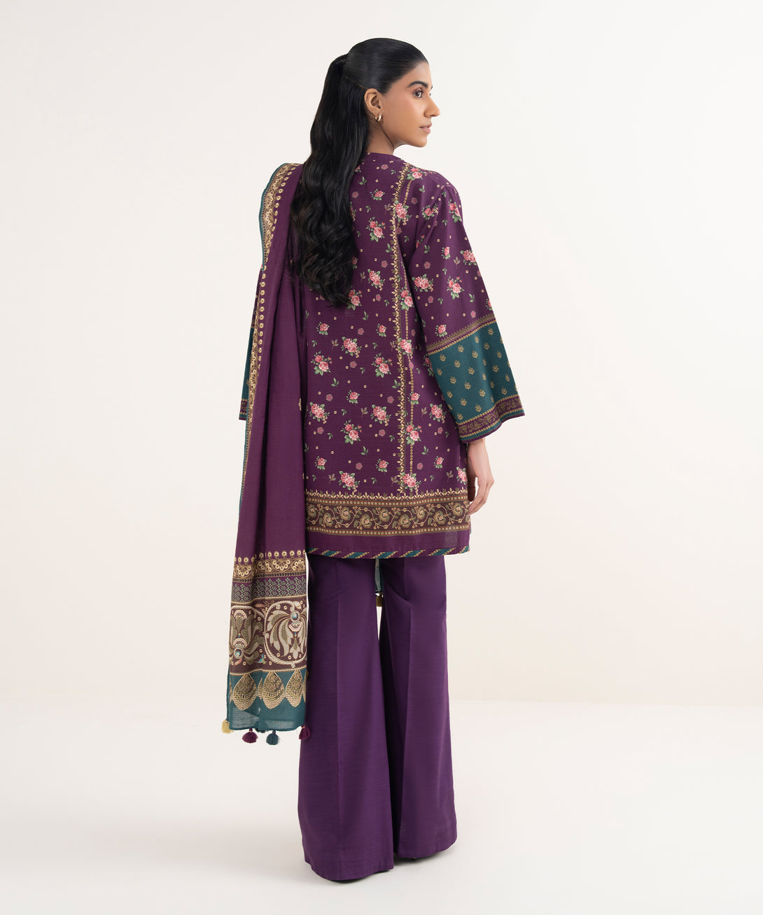 Make a statement with our three-piece printed purple ensemble featuring a cotton shirt and trousers paired with a matching dupatta.