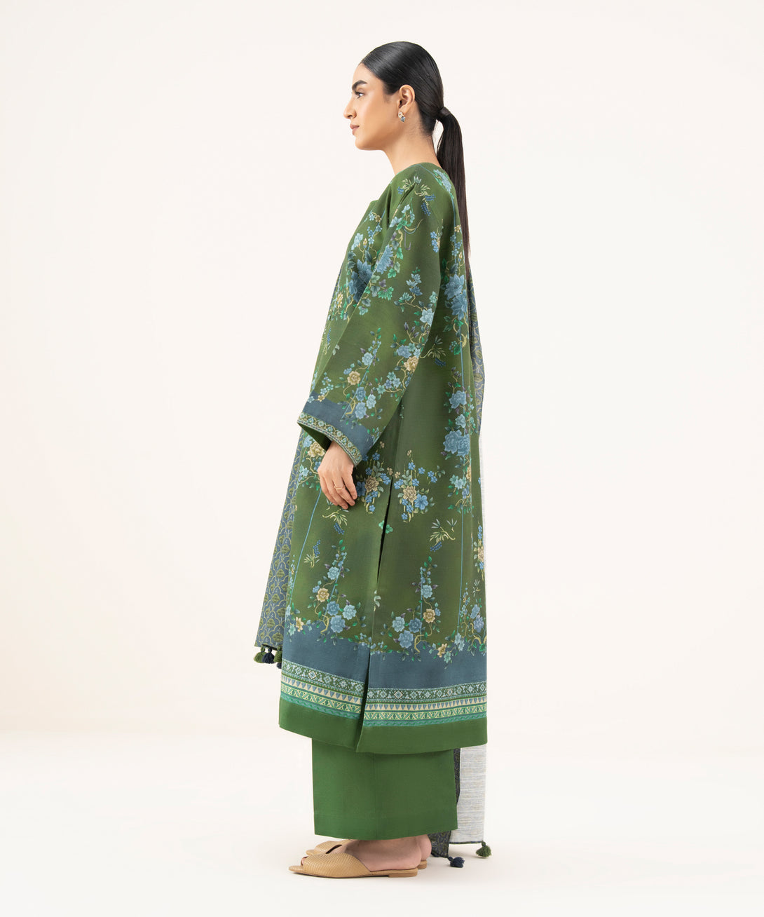 Make a statement with our three-piece printed green and blue ensemble featuring a cotton shirt and trousers paired with a voile dupatta.