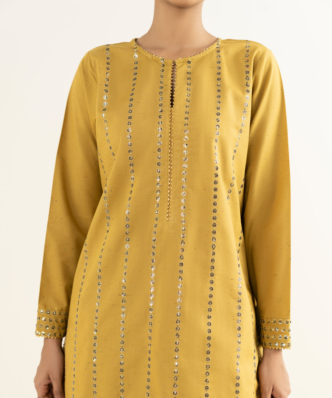 Revamp your wardrobe with our embroidered mustard multineps A-line shirt featuring a round neckline with slit.