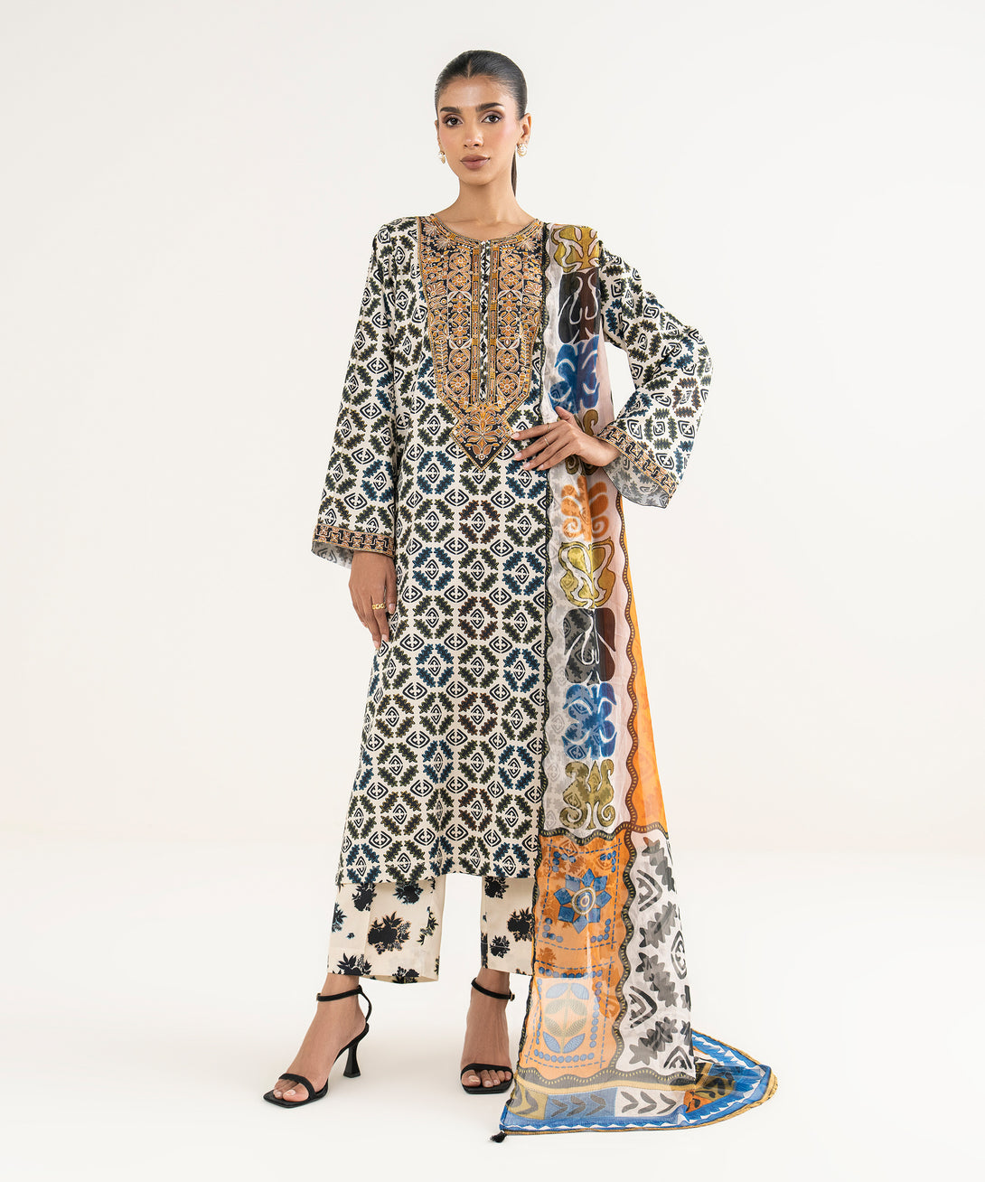 Printed With Embroidered Front Panel, Printed Back Panel, Round With Slit Neckline, Full Sleeves, Long Length