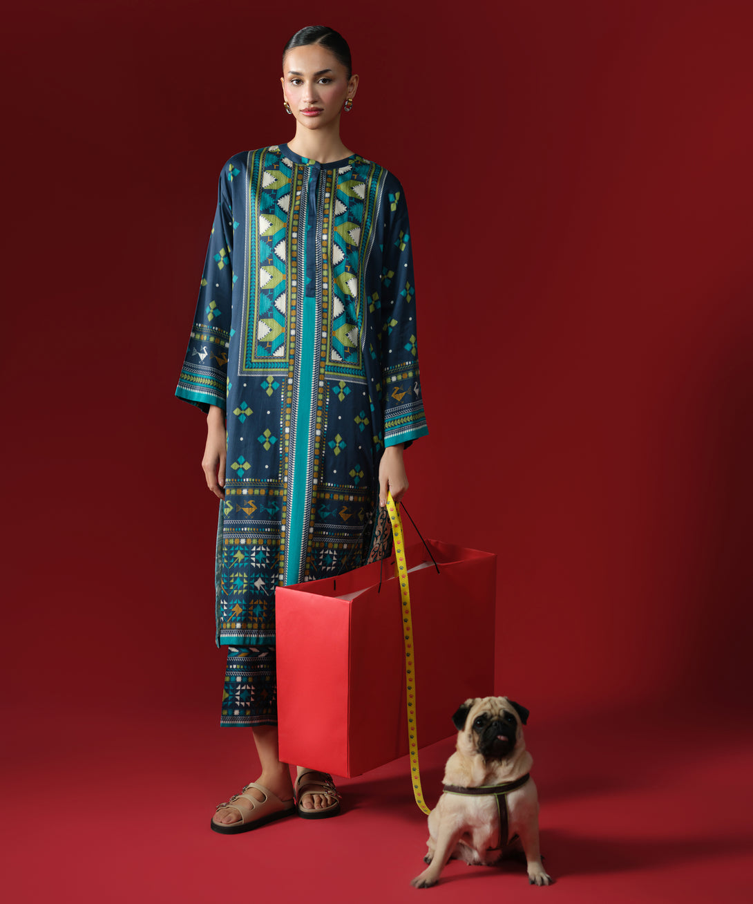 Printed With Embroidered Front Panel, Printed Back Panel, Ban With Placket Neckline, Full Sleeves, Long Length