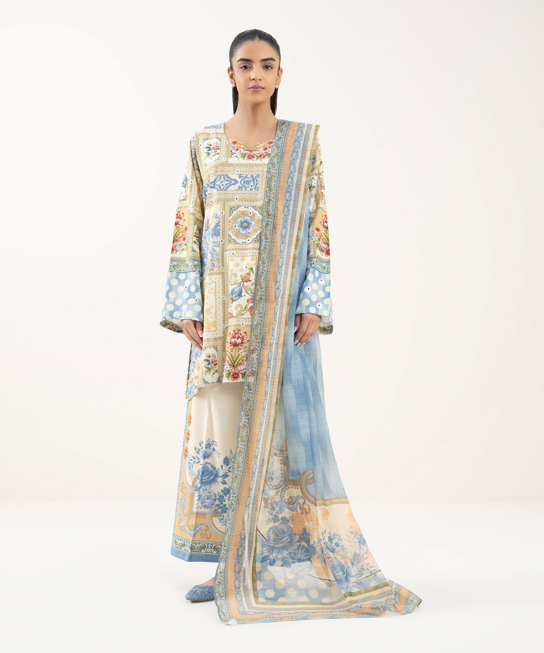 Printed With Embroidered Front Panel, Printed With Embroidered Back Panel, Square With Slit Neckline, Full Sleeves, Short Length