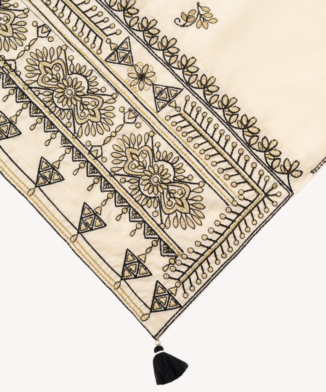 Drape yourself in our embroidered off white light khaddar dupatta with tassel details.