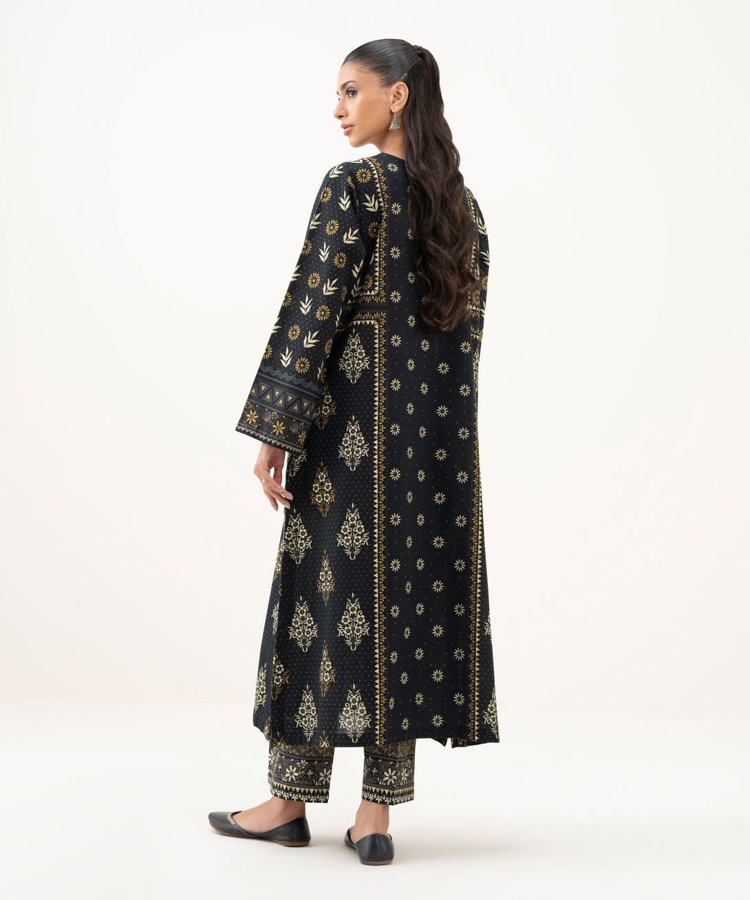 Revamp your closet in our printed black light khaddar straight shirt featuring a round neckline.