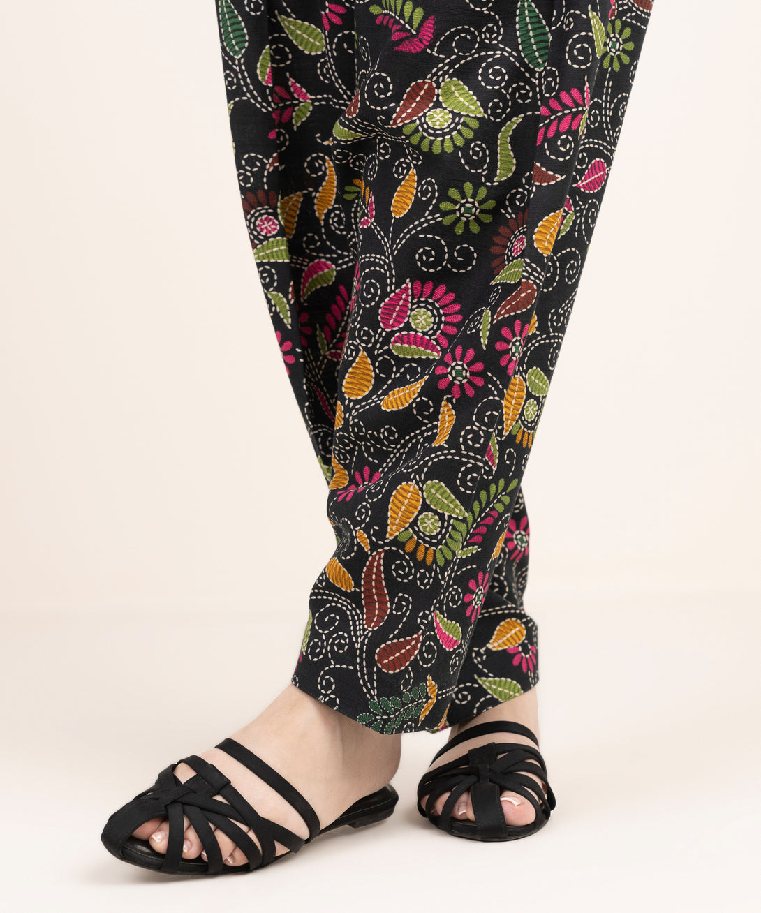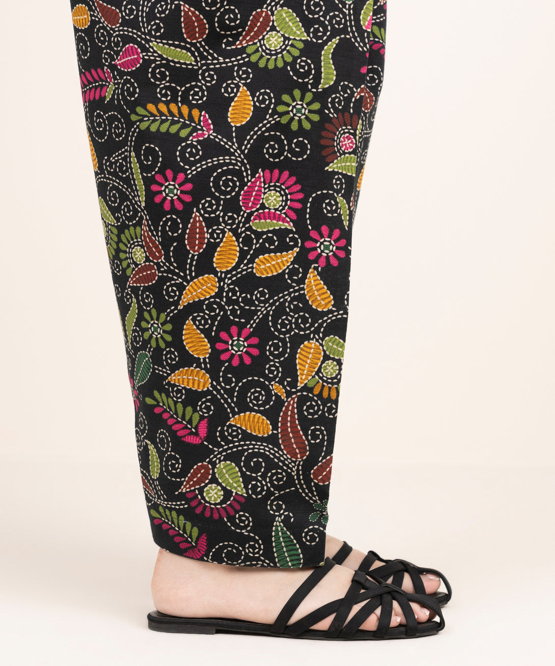 Step out in style in our printed black khaddar shalwar.