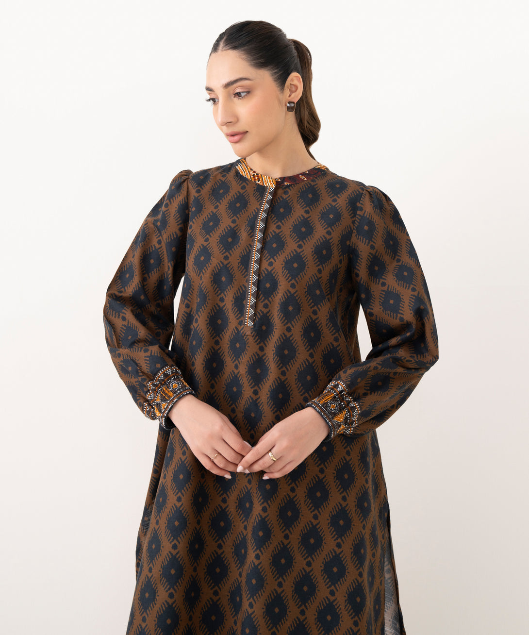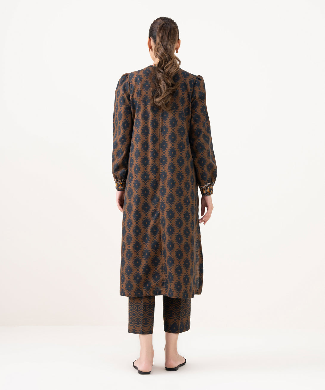 Upgrade your style in our printed brown and black light khaddar A-line shirt featuring a band neckline with placket.