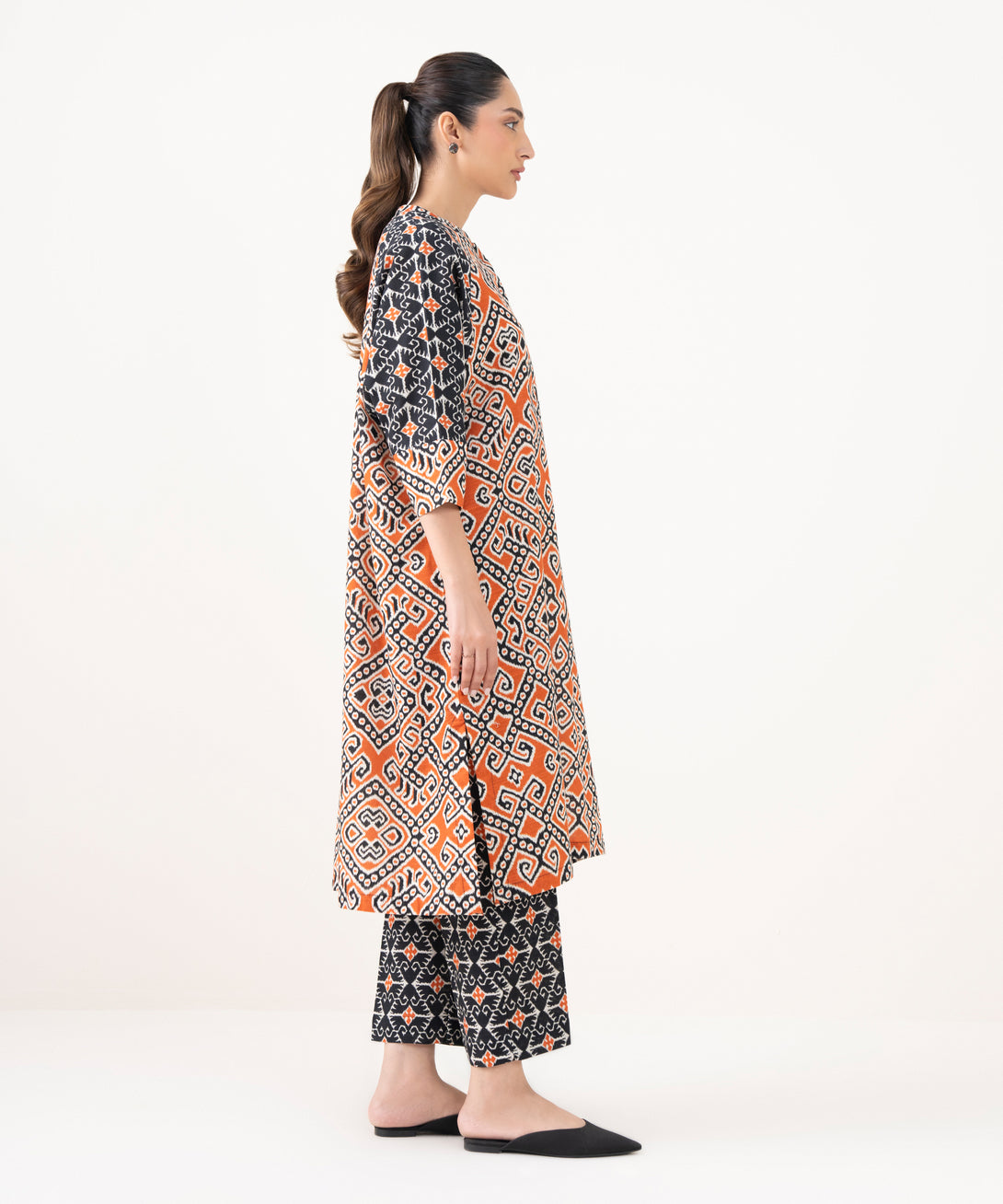 Printed Front Panel, Printed Back Panel, Ban With Placket Neckline, Full Sleeves, Long Length