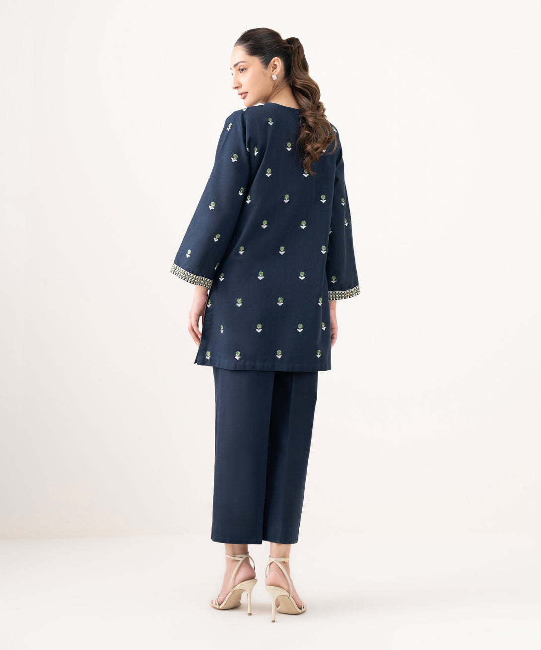 Dyed With Embroidered Front Panel, Dyed With Embroidered Back Panel, Round Neckline, Full Sleeves, Short Length