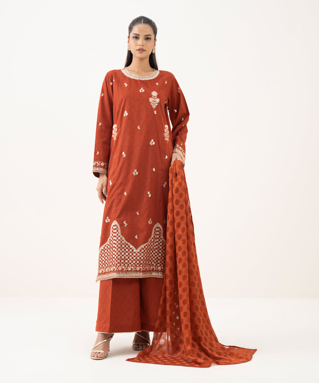 Upgrade your wardrobe with our embroidered red cotton jacquard A-line shirt featuring a round neckline.