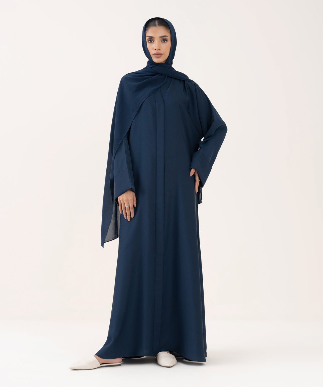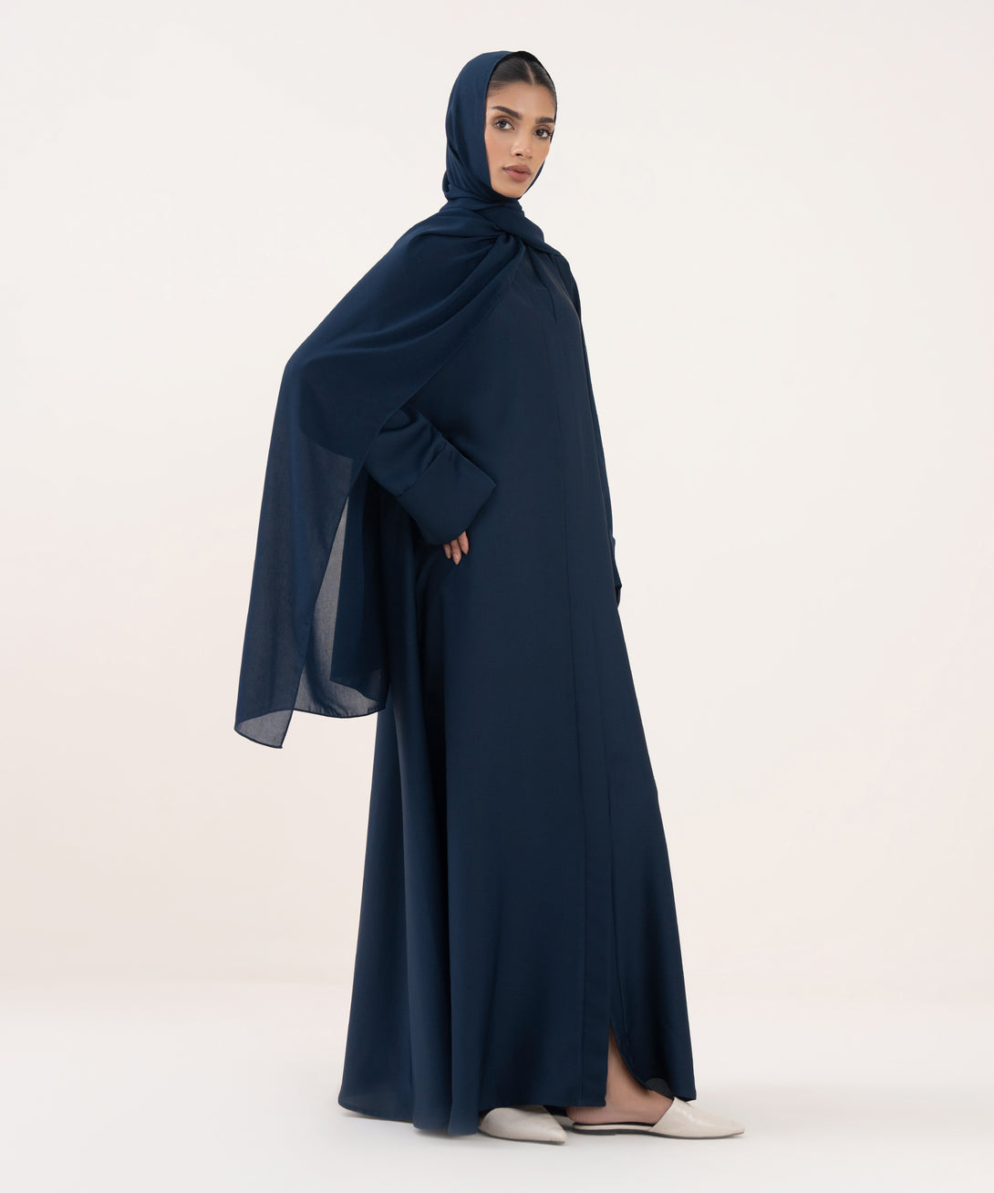 Full length abaya in soft drapey fabric. Button through front opening with v neckline. Full length kimono sleeves with exaggerated turned up cuffs.
