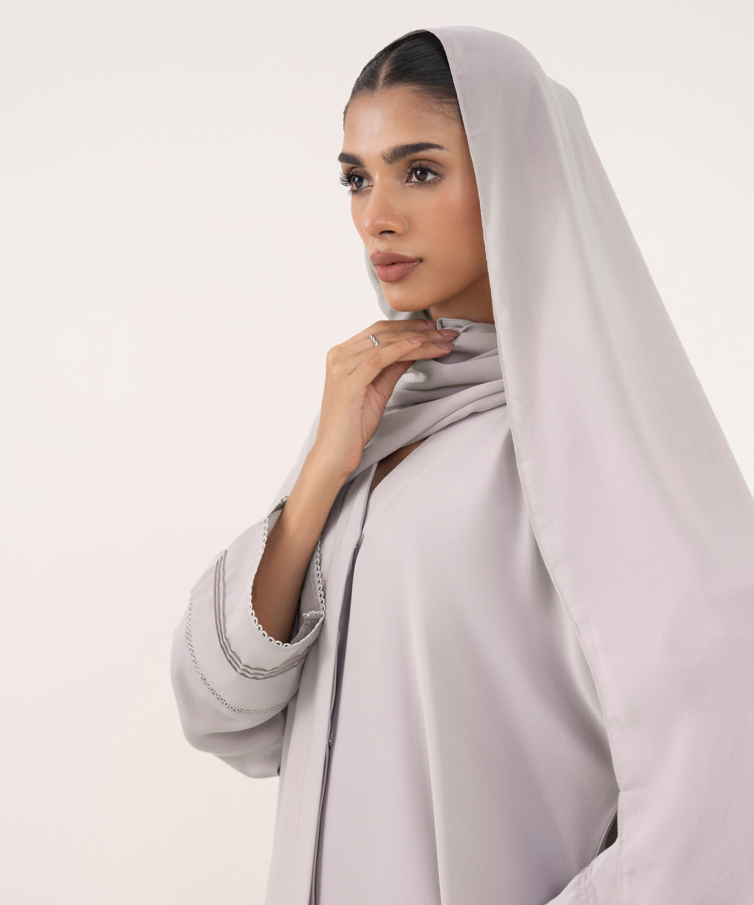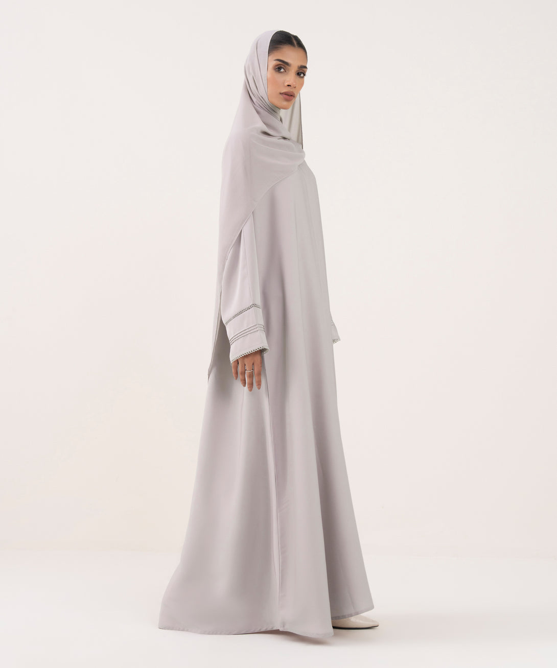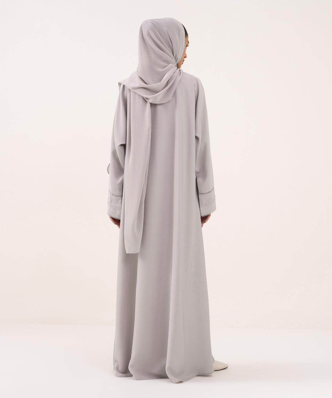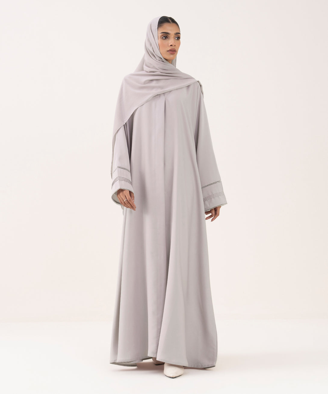 Full length abaya in soft drapey fabric. Button through front opening with v neckline. Full sleeves with pleats and lace detail on sleeve cuffs.