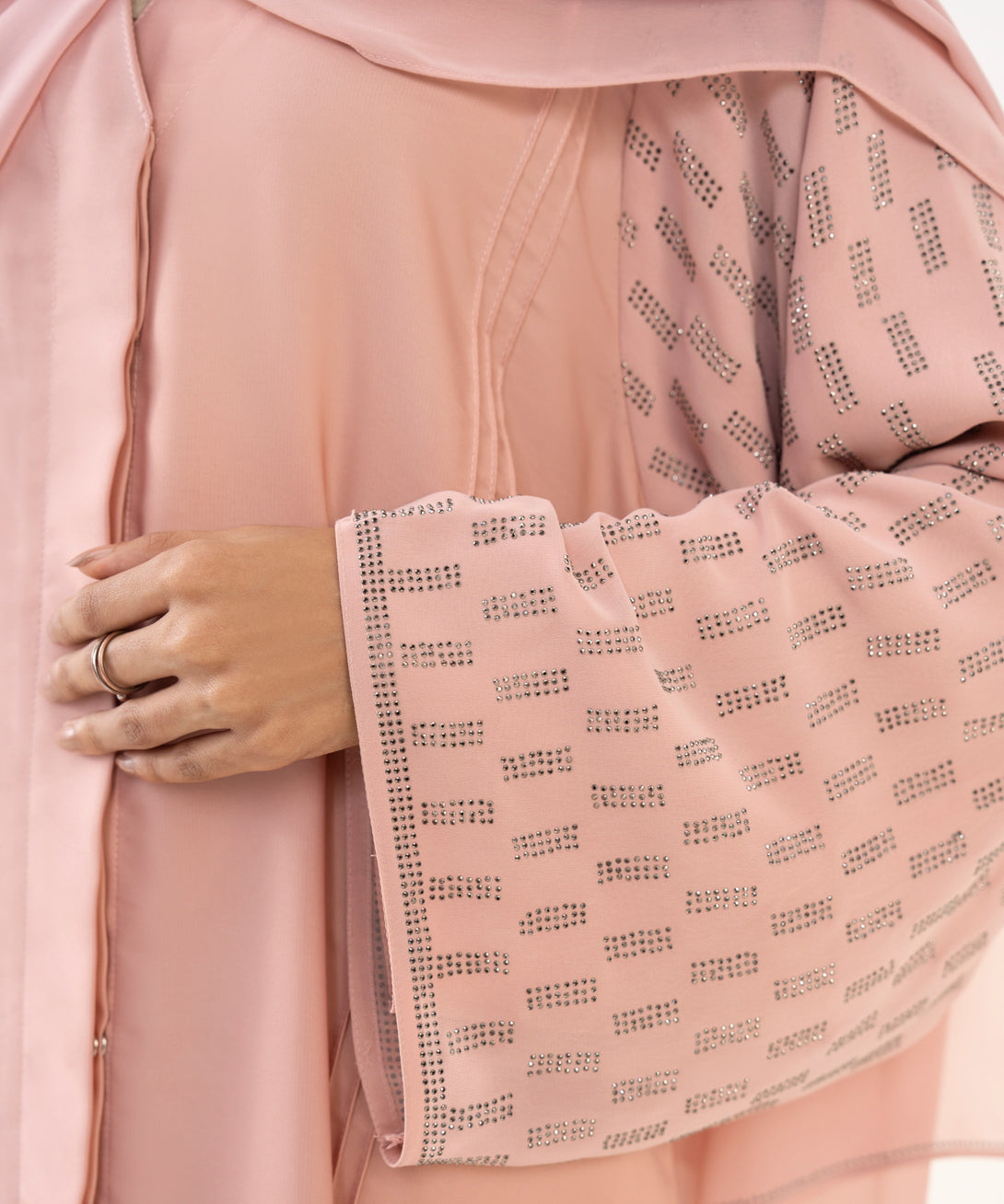 Full length abaya set in soft drapey fabric. Button through front opening with v neckline. Pleat detailing and double layered sleeves with diamnte embellishment. Matching hijab included.