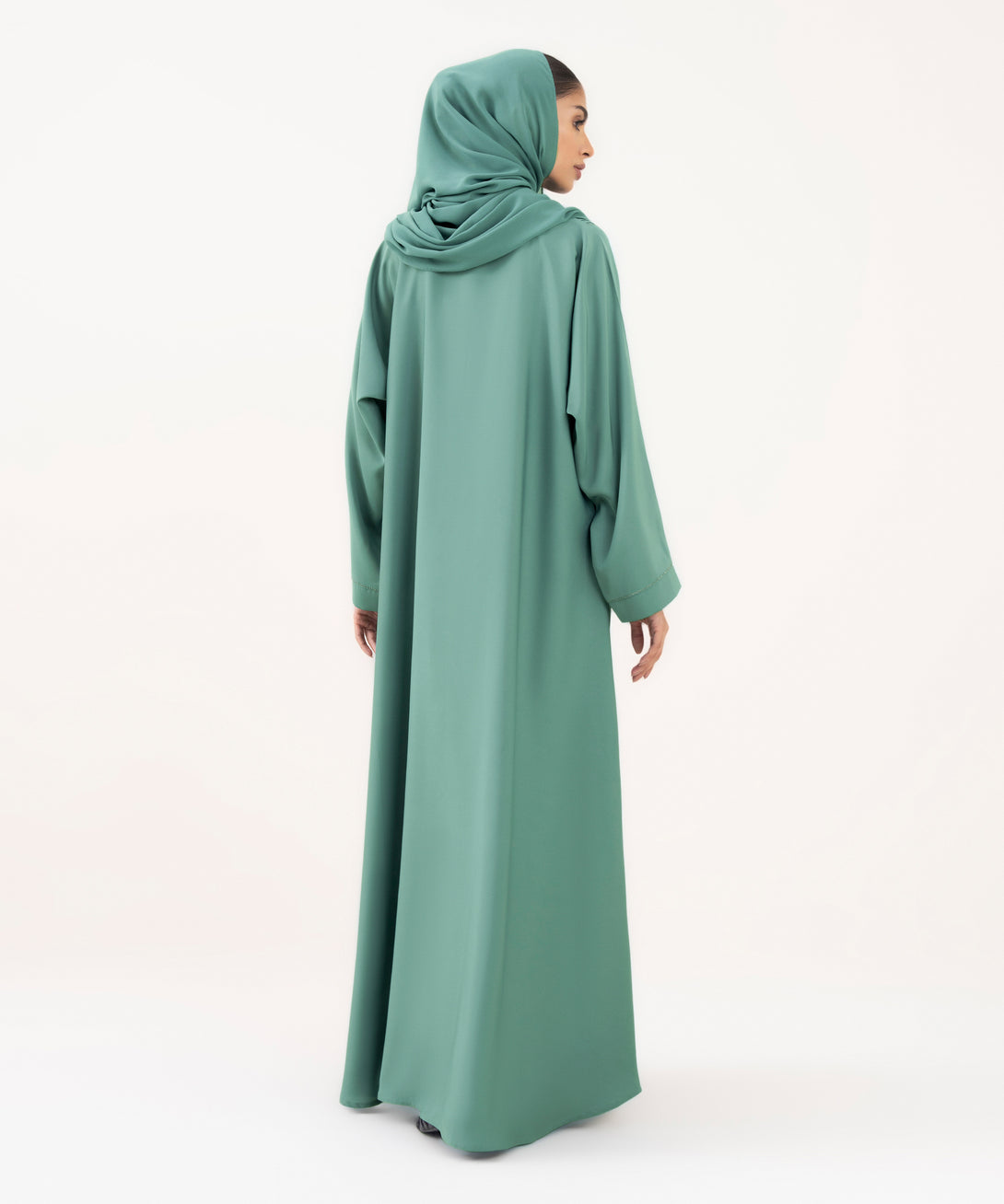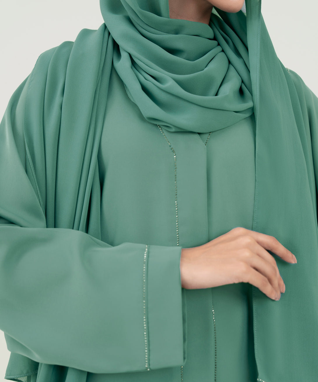 Full length abaya set in soft drapey fabric. Button through front opening with v neckline. Pleat and diamante embellishment on sleeves. Matching hijab included.